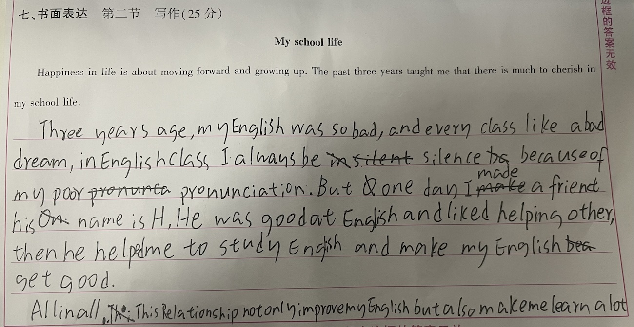 Three years ago, my English was so bad, and every class like a bad dream, in English class, I always be in silent silence because of my poor pronunciation. But one day, I make a friend, his name is H. He was good at English and liked helping others, then he help me to study English and make my English be get good.