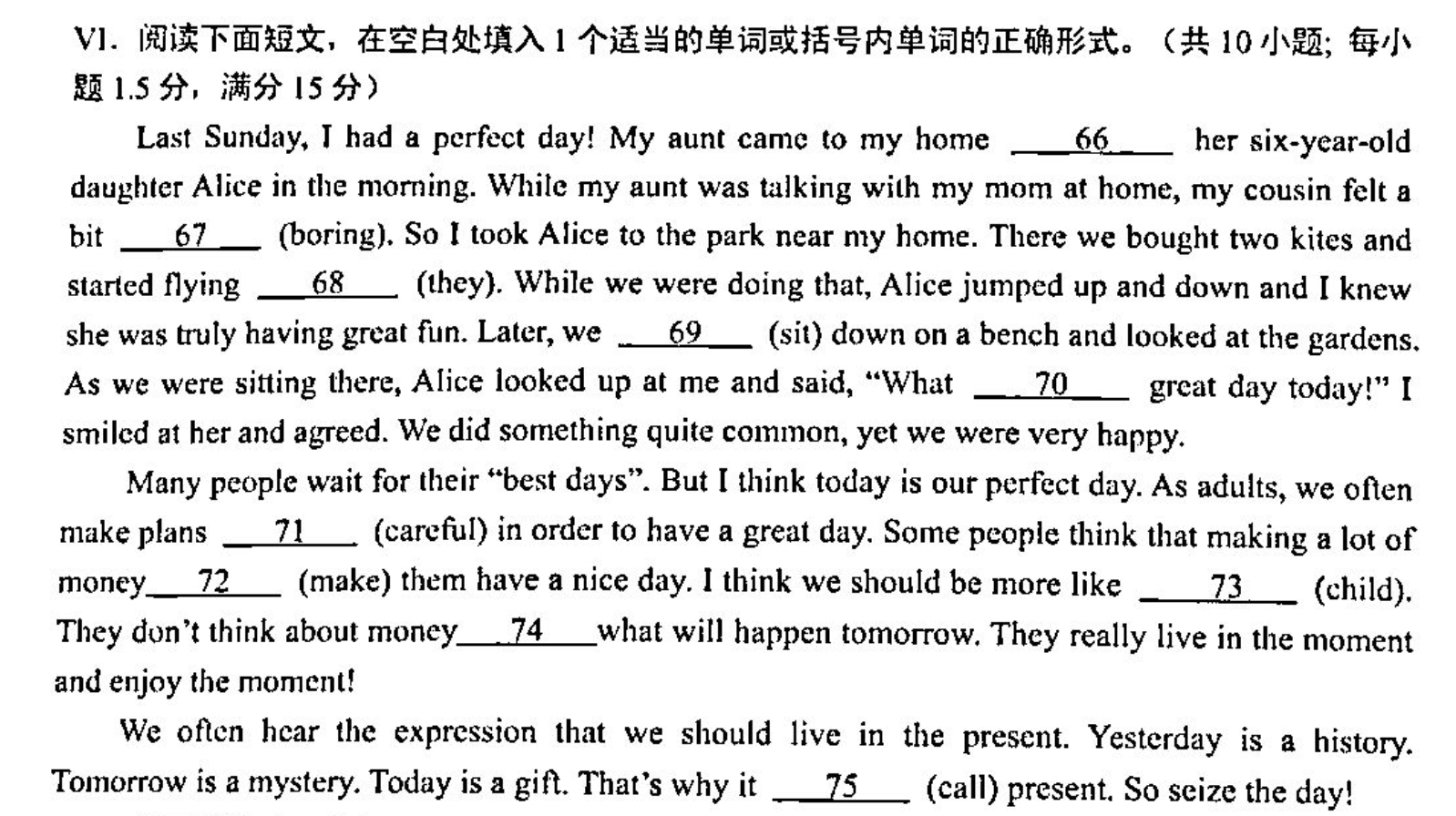 VI. 顺读下面笔述,在室栏处聊人1个途着的单词或指导另单词的正确形式。(共10小题;每小题 1.5 分,满分 15 分)