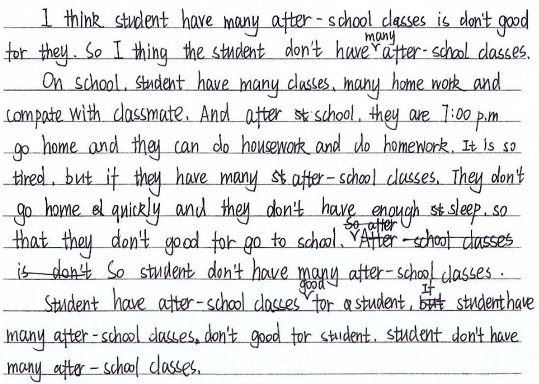图像中的手写英文是“I think student have many after-school classes is don’t good for they. So I thing the student don’t have after-school classes. On school, student have many classes, many home work and compate with classmate. And after school, they are 7:00 p.m go home and they can do homework and do homework. It is so tired, but if they have many st after-school classes, They don’t go home el quickly and they don’t have enough st sleep. So that they don’t good for go to school, YAfter school classes is don’t So student don’t have many after-school classes. Student have after-school classes for a student, but student have many after-school classes, don’t good for student. student don’t have many after-school classes.”