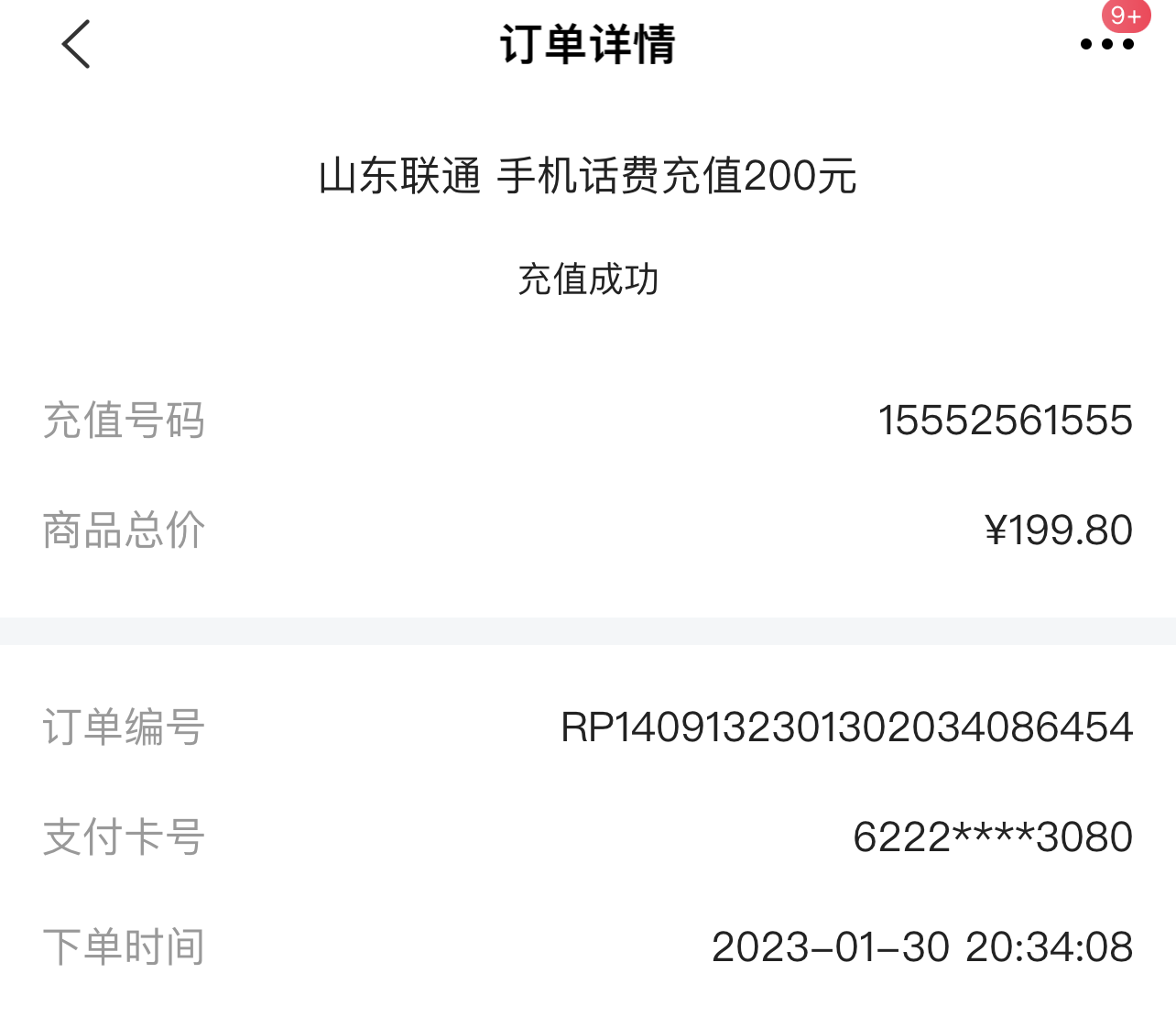 充值号码:15552561555,商品总价:¥199.80,订单编号:RP1409132301302034086454,下单时间:2023-01-30 20:34:08。