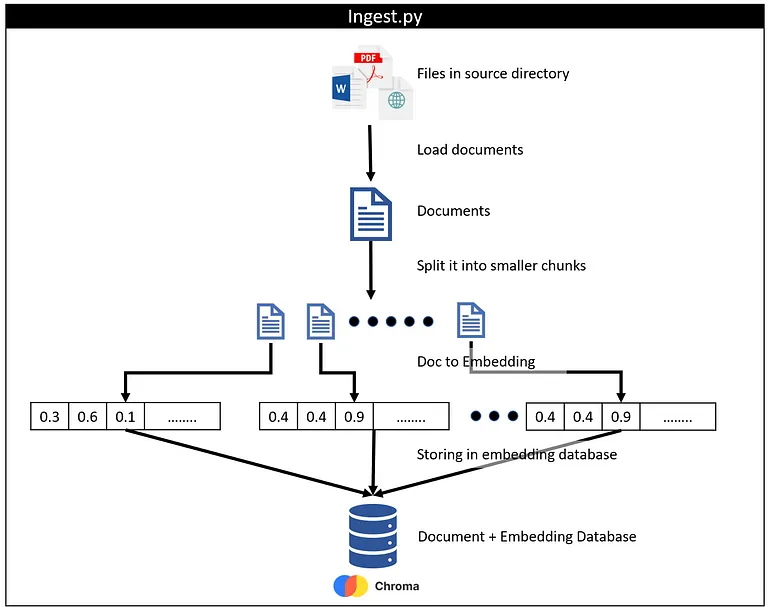 图像中描述的是一个文件处理流程,它从文件名“Ingest.py”开始,通过一系列的步骤将文件从源目录中读取,然后将文件拆分成小块,并将这些小块转换为浮点数,最后将这些数据存储到一个文件与映像库的结合的数据库中。