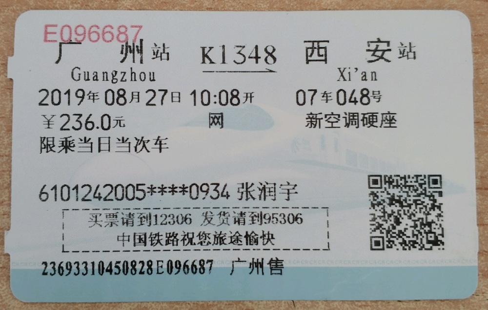 车次:K1348,始发站:Guangzhou,到达站:Xi'an,日期:2019年08月27日,车厢号:07号048号,金额:236.0元,姓名:陈美田,姓名:刘文军。