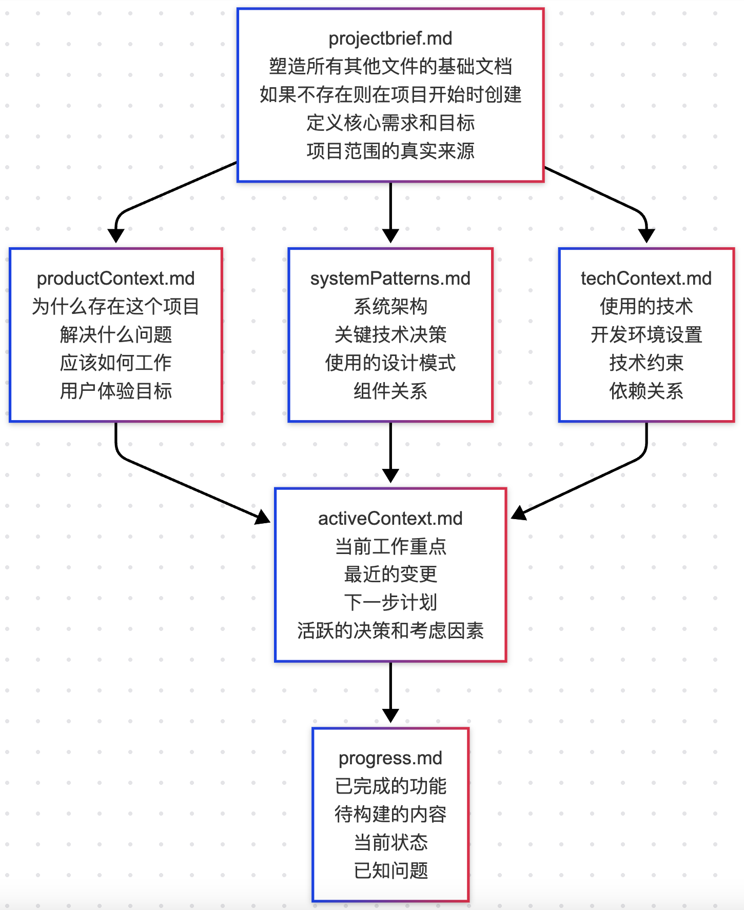 记忆库由必需的核心文件和可选的上下文文件组成,均为 Markdown 格式。文件之间以清晰的层次结构构建:
