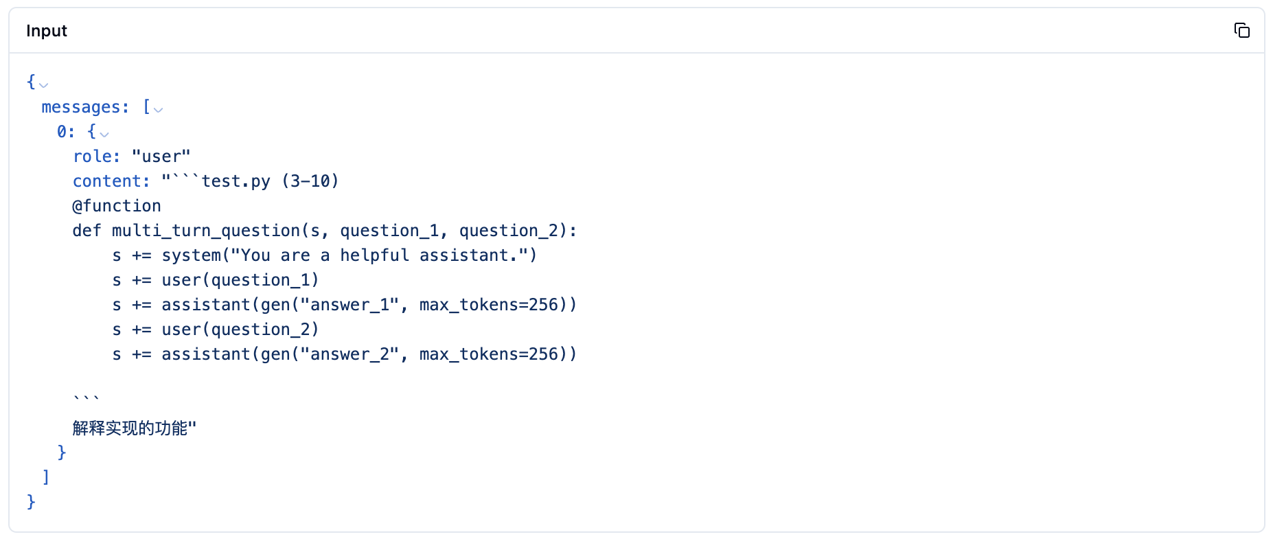 "content": "这段代码是一个多轮对话的生成函数,使用了一种类似于对话模型的框架。让我们逐步解释它的功能和实现方式:\n\n1. **装饰器 `@function`**:\n - 这个装饰器可能是一个自定义的装饰器,用于标记 `multi_turn_question` 函数为一个特定类型的函数,例如一个对话生成函数。\n\n2. **函数 `multi_turn_question`**:\n - 这个函数接受四个参数:\n - `s`:一个字符串或对象,用于构建对话流。\n - `question_1`:第一个问题。\n - `question_2`:第二个问题。\n\n3. **构建对话流**:\n - `s += system(\"You are a helpful assistant.\")`:\n - 这行代码将系统角色的初始提示添加到对话流中,告诉模型“你是一个有用的助手”。\n - `s += user(question_1)`:\n - 这行代码将用户的第一轮问题添加到对话流中。\n - `s += assistant(gen(\"answer_1\", max_tokens=256))`:\n - 这行代码生成第一个问题的答案,并将其添加到对话流中。`gen` 函数可能是一个生成器函数,用于生成模型的回答,`max_tokens=256` 限制了生成的回答的最大长度。\n - `s += user(question_2)`:\n - 这行代码将用户的第二轮问题添加到对话流中。\n - `s += assistant(gen(\"answer_2\", max_tokens=256))`:\n - 这行代码生成第二个问题的答案,并将其添加到对话流中。\n\n4. **返回值**:\n - 函数没有显式返回值,但它通过修改传入的 `s` 对象构建了一个完整的多轮对话流。\n\n总结起来,`multi_turn_question` 函数的作用是构建一个包含两轮用户提问和助手回答的对话流。通过使用 `system`、`user` 和 `assistant` 等方法,它逐步构建了一个结构化的对话,其中每一部分都由相应的内容填充。最终,这个对话流可以被用于生成或展示多轮对话的内容。",