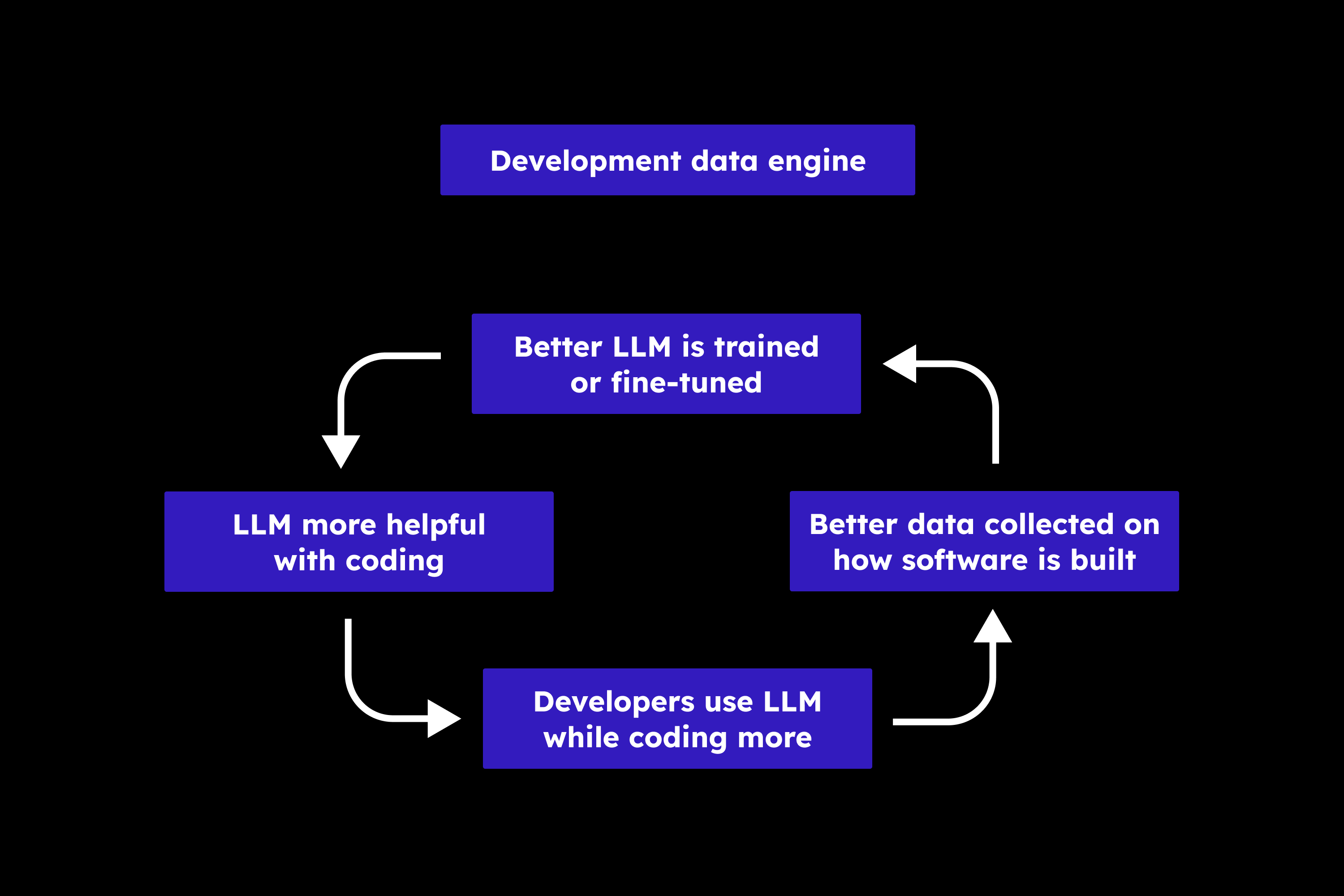 首先,理解他们的开发者如何使用LLMs,并通过收集开发数据——即他们组织构建软件的方式——来展示使用LLMs的投资回报率(ROI)。 然后,利用这个基础建立一个开发数据引擎——一个确保LLMs始终拥有最新信息和代码的持续反馈循环,以他们偏好的风格呈现。 通过展示ROI来增加LLMs预算的工程组织将能够保留他们的顶尖开发者。当新的、有才华的开发者在选择组织时,可用LLMs的质量将是一个重要因素。开发者将会加入并留在那些通过不断改进的LLMs赋予他们力量的地方——这些模型了解他们代码库、项目、风格、最佳实践和技术栈的最新情况。