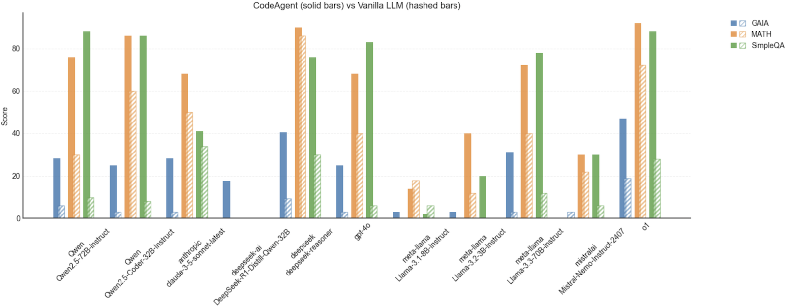 这是一个最近的例子,比较了一些前沿 LLM 的性能,有的有代理框架,有的没有(在这种情况下是简单的 smolagents 库)- 使用代理框架可以将性能提高多达 60 分!
