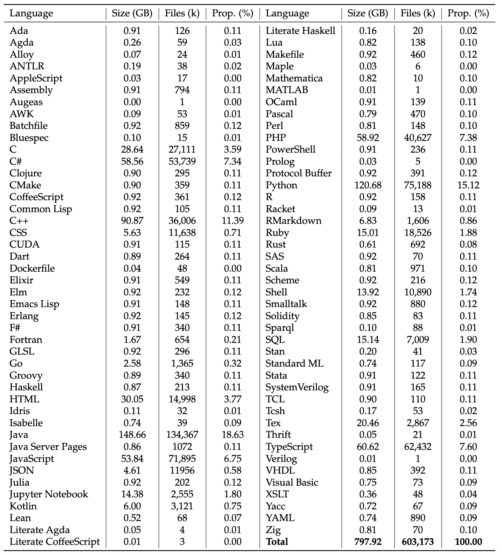 下表中列出保留的87种编程语言统计摘要(磁盘大小、文件数量和百分比),总数据量为798 GB,包含603百万个文件。