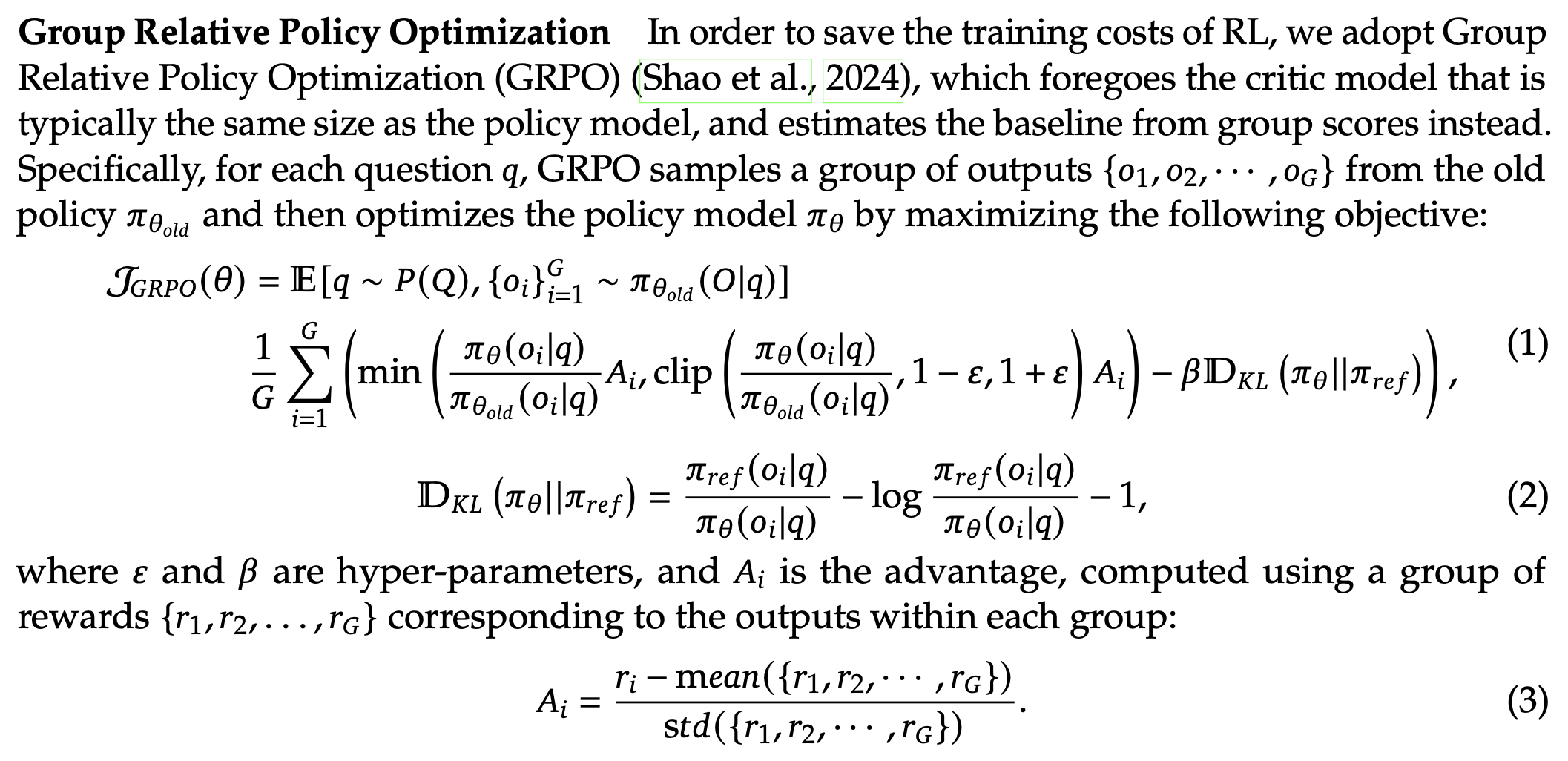 组相对策略优化 为了节省RL的训练成本,我们采用了Group Relative Policy Optimization(GRPO)(Shao等,2024),它放弃了通常与策略模型大小相同的评论家模型,并从组分数中估计基线。具体来说,对于每个问题𝑞,GRPO从旧策略𝜋𝜃𝑜𝑙𝑑中采样一组输出{𝑜1, 𝑜2,···,𝑜𝐺},然后通过最大化以下目标来优化策略模型𝜋𝜃:
