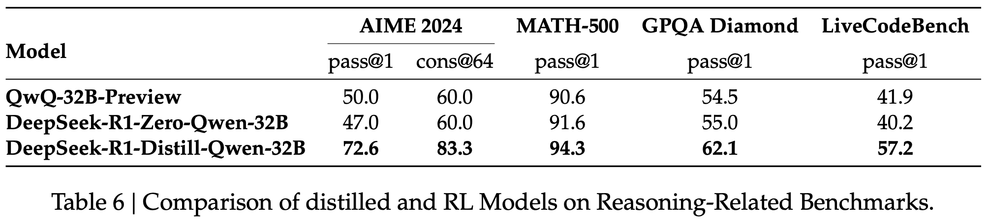To answer this question, we conduct large-scale RL training on Qwen-32B-Base using math, code, and STEM data, training for over 10K steps, resulting in DeepSeek-R1-Zero-Qwen-32B. The experimental results, shown in Figure 6, demonstrate that the 32B base model, after large-scale RL training, achieves performance on par with QwQ-32B-Preview. However, DeepSeek-R1- Distill-Qwen-32B, which is distilled from DeepSeek-R1, performs significantly better than DeepSeek-R1-Zero-Qwen-32B across all benchmarks. Therefore, we can draw two conclusions: First, distilling more powerful models into smaller ones yields excellent results, whereas smaller models relying on the large-scale RL mentioned in this paper require enormous computational power and may not even achieve the performance of distillation. Second, while distillation strategies are both economical and effective, advancing beyond the boundaries of intelligence may still require more powerful base models and larger-scale reinforcement learning.
