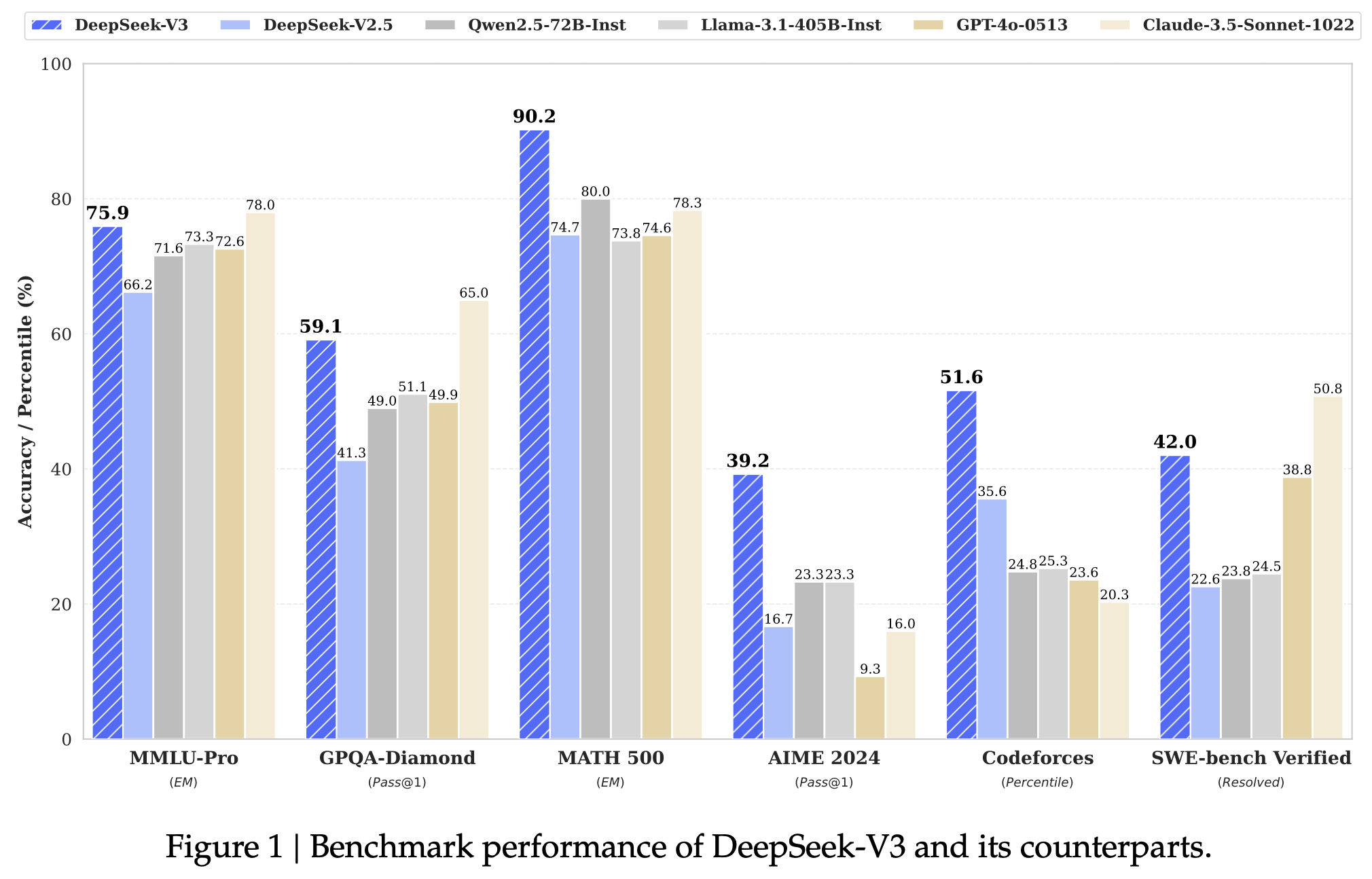 图1 DeepSeek-V3 及其对手的基准性能。