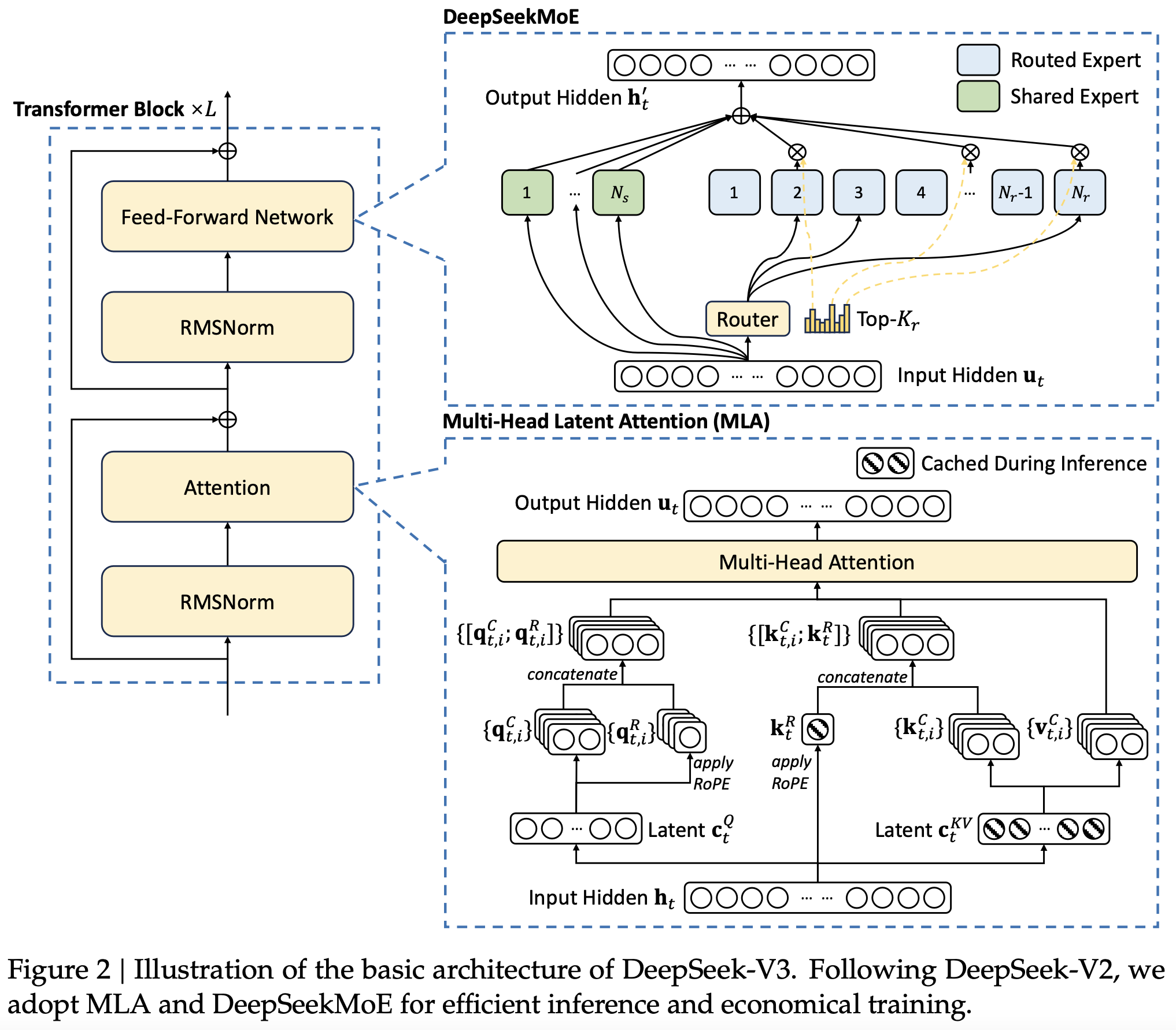 The basic architecture of DeepSeek-V3 is still within the Transformer (Vaswani et al., 2017) framework. For efficient inference and economical training, DeepSeek-V3 also adopts MLA and DeepSeekMoE, which have been thoroughly validated by DeepSeek-V2. Compared with DeepSeek-V2, an exception is that we additionally introduce an auxiliary-loss-free load balancing strategy (Wang et al., 2024a) for DeepSeekMoE to mitigate the performance degradation induced by the effort to ensure load balance. Figure 2 illustrates the basic architecture of DeepSeek-V3, and we will briefly review the details of MLA and DeepSeekMoE in this section.