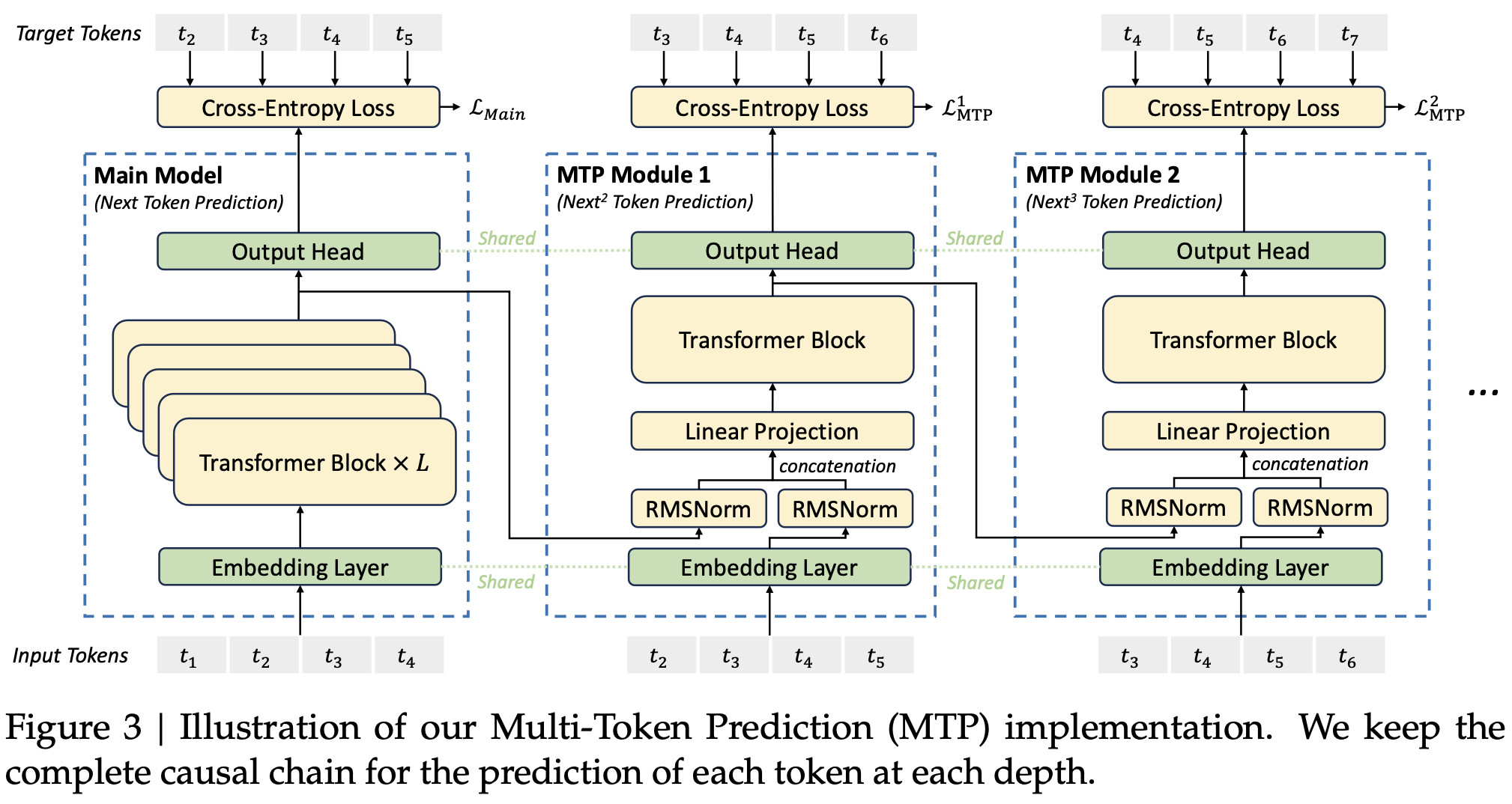 图3 我们的多标记预测(MTP)实现示意图。我们在每个深度保留每个标记的预测的完整因果链。