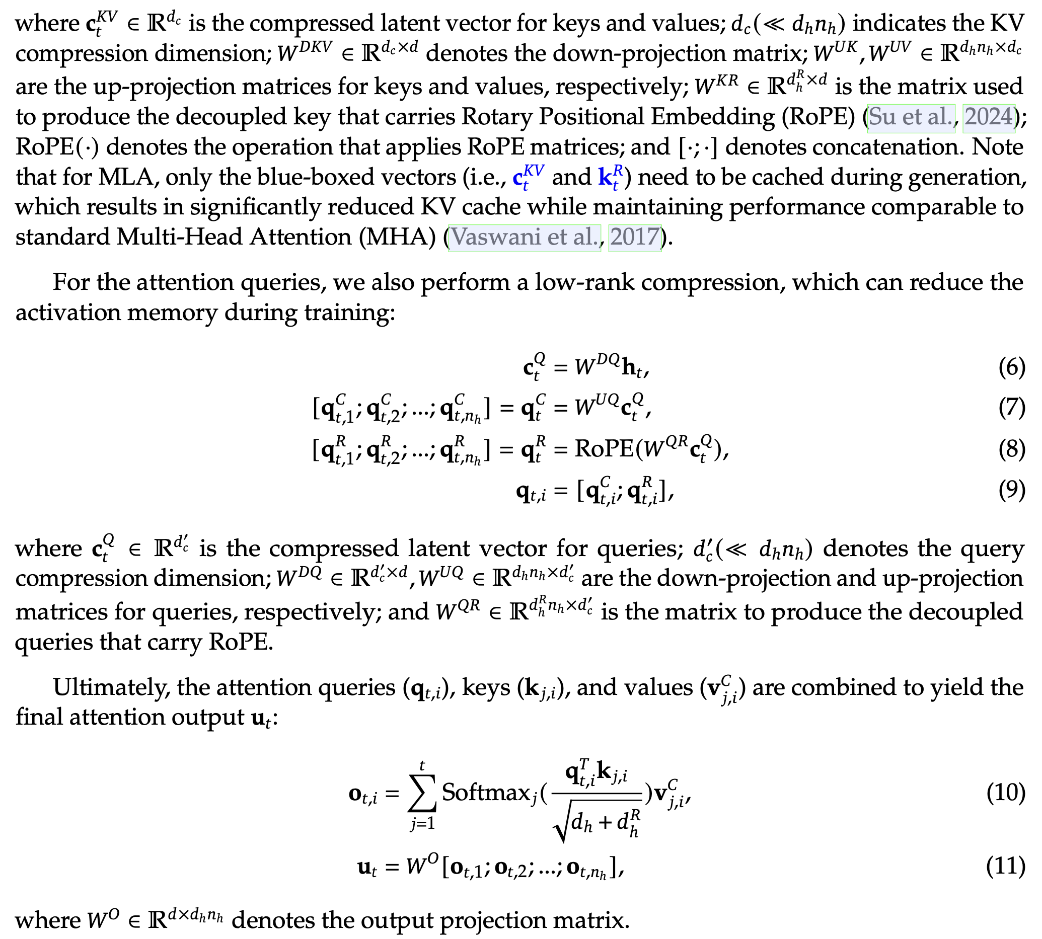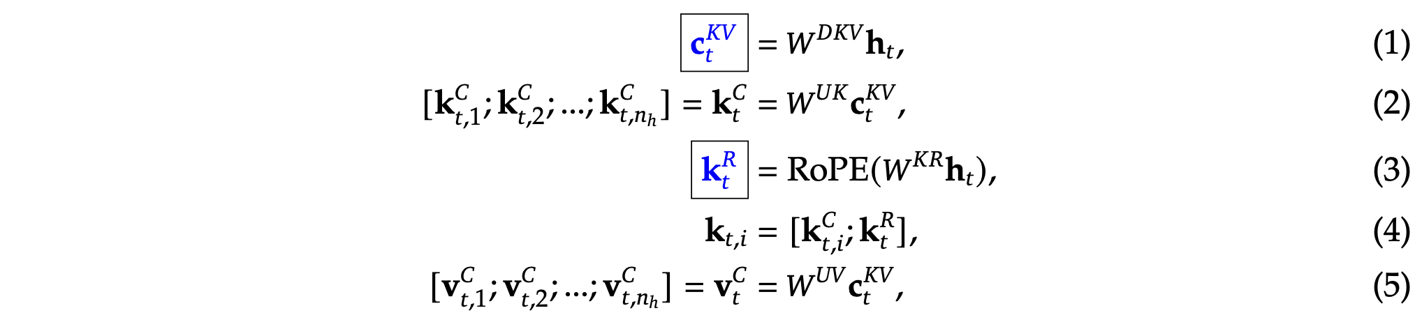 ℎ×𝑑 is the matrix used to produce the decoupled key that carries Rotary Positional Embedding (RoPE) (Su et al., 2024); RoPE(·)denotes the operation that applies RoPE matrices; and [·;·]denotes concatenation. Note that for MLA, only the blue-boxed vectors need to be cached during generation, which results in significantly reduced KV cache while maintaining performance comparable to standard Multi-Head Attention (MHA) (Vaswani et al., 2017).