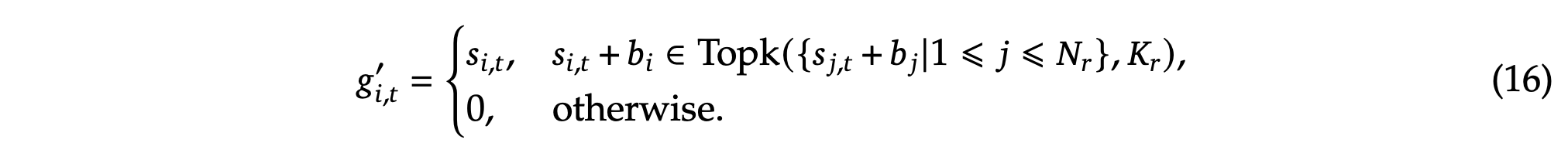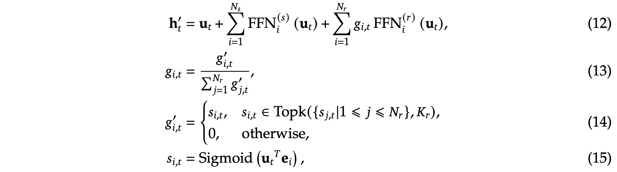 where 𝑁𝑠 and 𝑁𝑟 denote the numbers of shared experts and routed experts, respectively; FFN(𝑠)𝑖 (·) and FFN(𝑟)𝑖 (·)denote the 𝑖-th shared expert and the 𝑖-th routed expert, respectively; 𝐾𝑟 denotes the number of activated routed experts; 𝑔𝑖,𝑡 is the gating value for the 𝑖-th expert; 𝑠𝑖,𝑡 is the token-to-expert affinity; e𝑖 is the centroid vector of the 𝑖-th routed expert; and Topk(·, 𝐾)denotes the set comprising 𝐾 highest scores among the affinity scores calculated for the 𝑡-th token and all routed experts. Slightly different from DeepSeek-V2, DeepSeek-V3 uses the sigmoid function to compute the affinity scores, and applies a normalization among all selected affinity scores to produce the gating values.