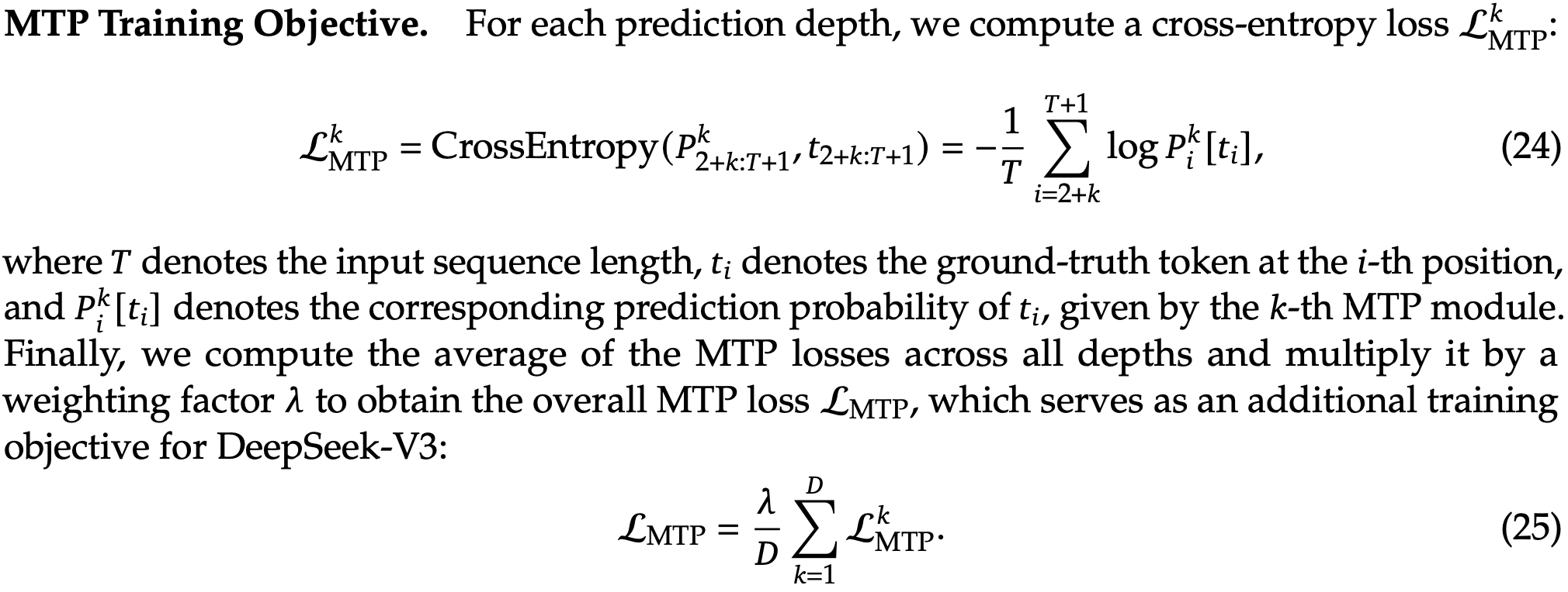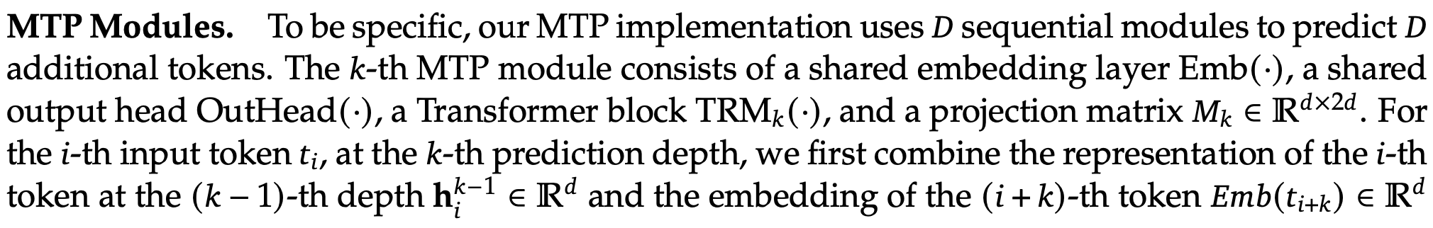 Inspired by Gloeckle et al. (2024), we investigate and set a Multi-Token Prediction (MTP) objective for DeepSeek-V3, which extends the prediction scope to multiple future tokens at each position. On the one hand, an MTP objective densifies the training signals and may improve data efficiency. On the other hand, MTP may enable the model to pre-plan its representations for better prediction of future tokens. Figure 3 illustrates our implementation of MTP. Different from Gloeckle et al. (2024), which parallelly predicts 𝐷 additional tokens using independent output heads, we sequentially predict additional tokens and keep the complete causal chain at each prediction depth. We introduce the details of our MTP implementation in this section.