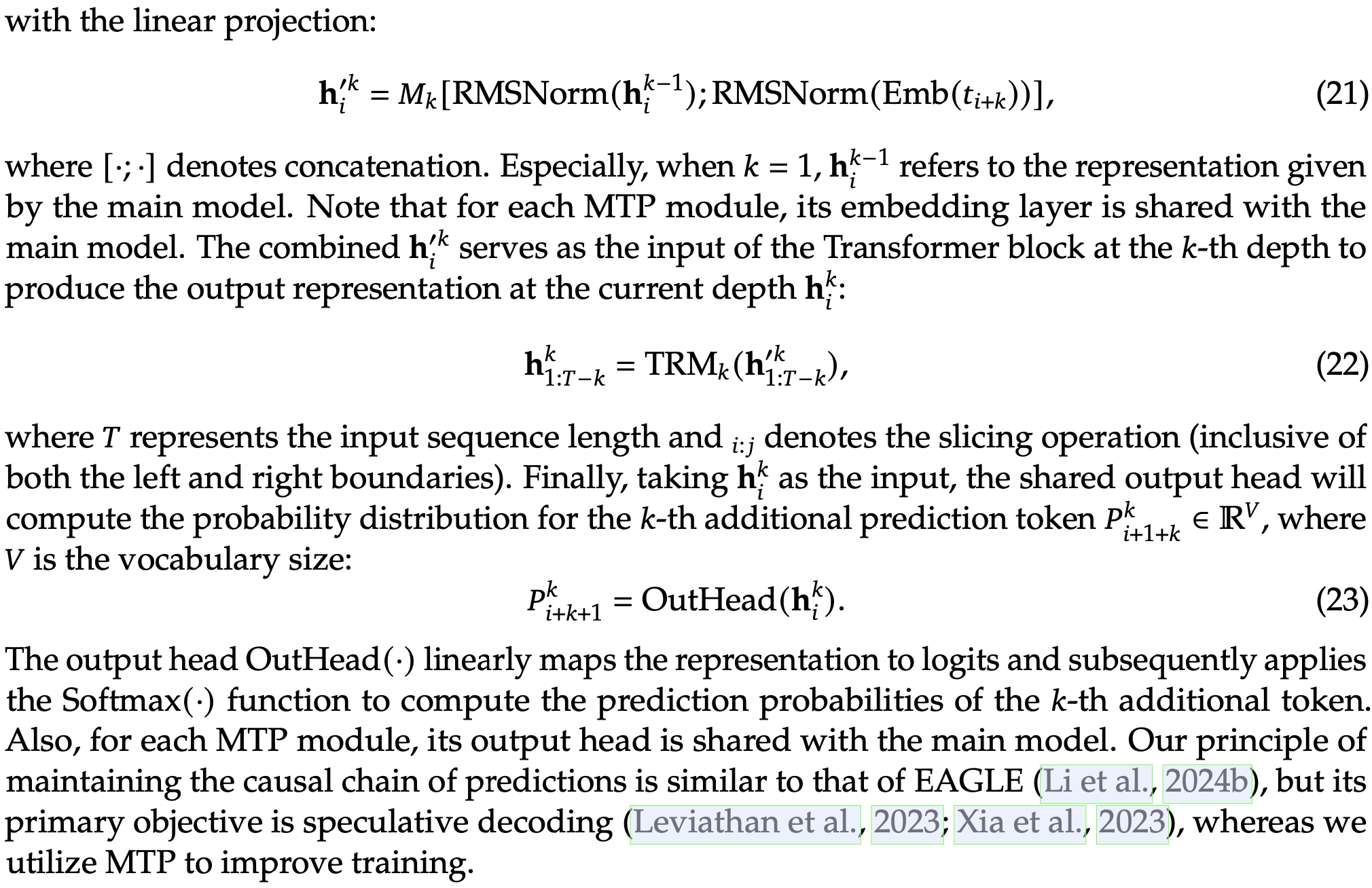 MTP in Inference. Our MTP strategy mainly aims to improve the performance of the main model, so during inference, we can directly discard the MTP modules and the main model can function independently and normally. Additionally, we can also repurpose these MTP modules for speculative decoding to further improve the generation latency.