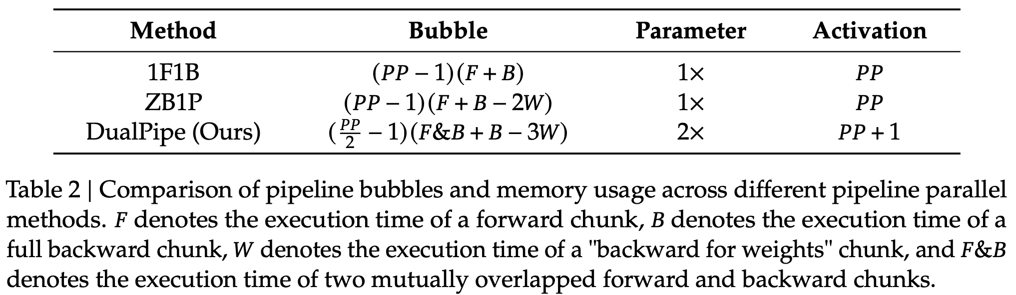 In addition, even in more general scenarios without a heavy communication burden, Du- alPipe still exhibits efficiency advantages. In Table 2, we summarize the pipeline bubbles and memory usage across different PP methods. As shown in the table, compared with ZB1P (Qi et al., 2023b) and 1F1B (Harlap et al., 2018), DualPipe significantly reduces the pipeline bubbles while only increasing the peak activation memory by 1 𝑃𝑃 times. Although DualPipe requires keeping two copies of the model parameters, this does not significantly increase the memory consumption since we use a large EP size during training. Compared with Chimera (Li and Hoefler, 2021), DualPipe only requires that the pipeline stages and micro-batches be divisible by 2, without requiring micro-batches to be divisible by pipeline stages. In addition, for DualPipe, neither the bubbles nor activation memory will increase as the number of micro-batches grows.