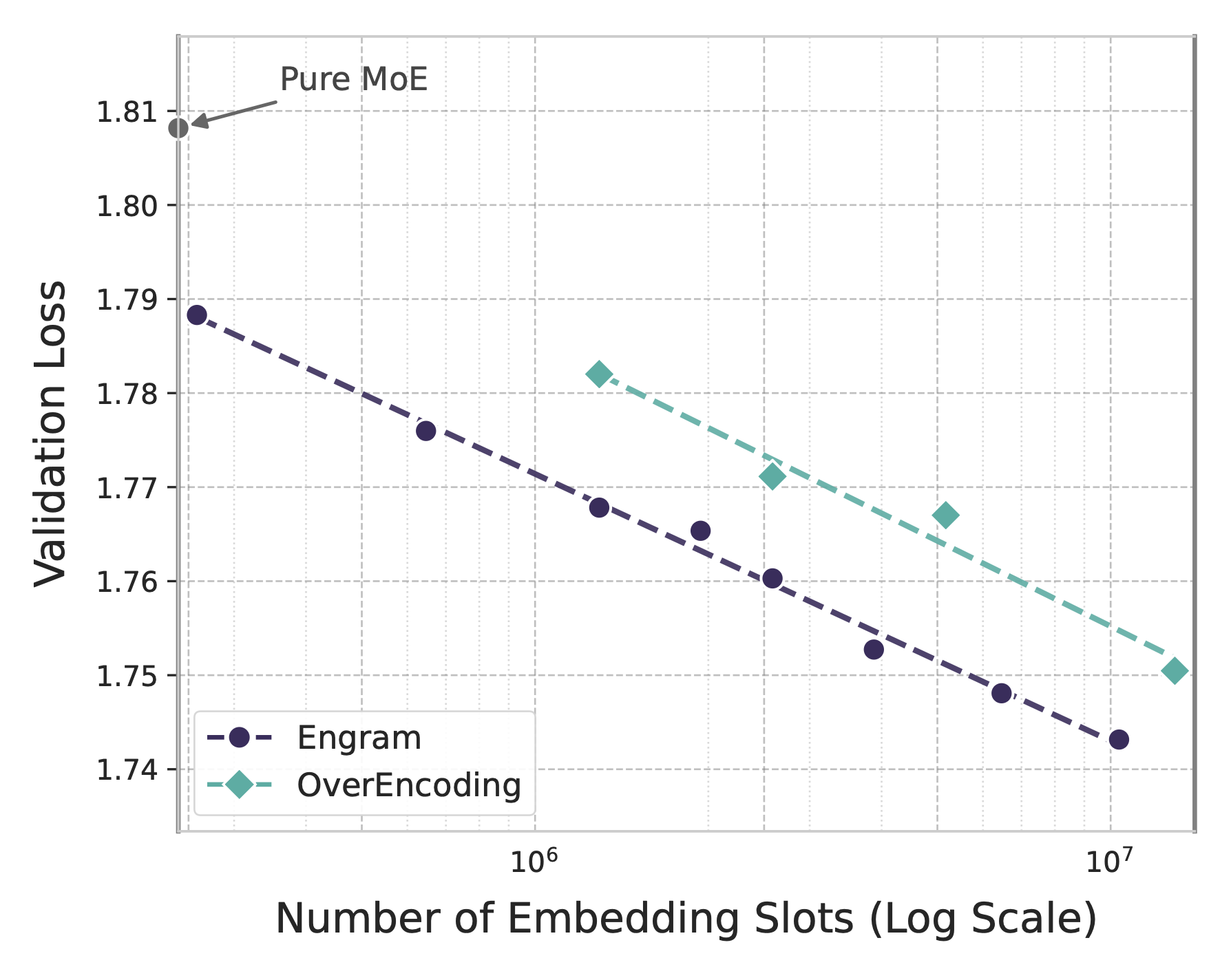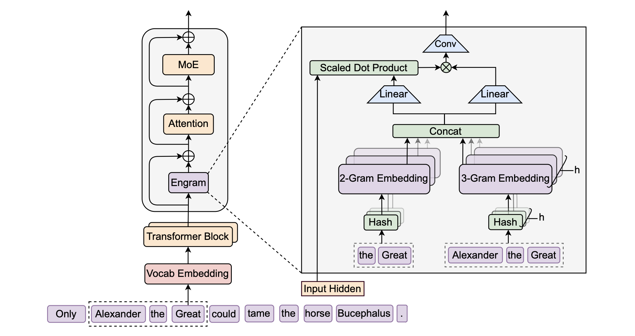 N-gram的访问频率符合齐夫定律(极少数模式占据绝大多数访问),Engram 支持多级缓存层次结构(Multi-Level Cache Hierarchy)。高频模式缓存在 GPU HBM 或主机内存中,长尾稀疏模式则可存放于 SSD,从而以极低延迟支持海量参数扩张。 - 异步预取 (Prefetching):与 MoE 的动态路由不同,Engram 的索引仅取决于