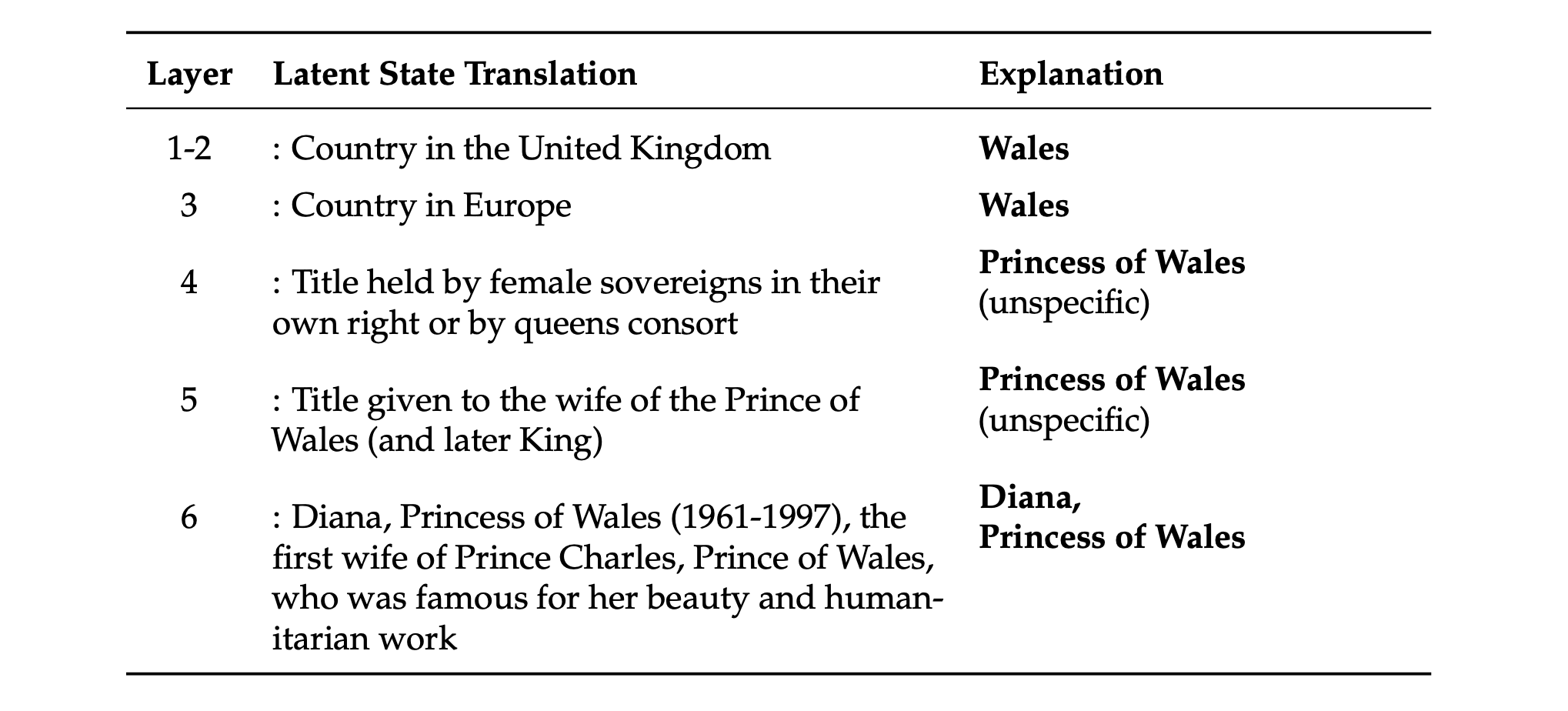 该表展示了大型语言模型(LLMs)如何通过层层注意力和前馈网络(FFNs)逐渐整合上下文 token,从而构建出实体“威尔士王妃戴安娜(Diana, Princess of Wales)”的内部表征。“潜状态转换(Latent State Translation)”列显示了由 PatchScope 针对最后一个 token“Wales”自动生成的文本,而“解释(Explanation)”列则给出了原作者提供的人工解读。