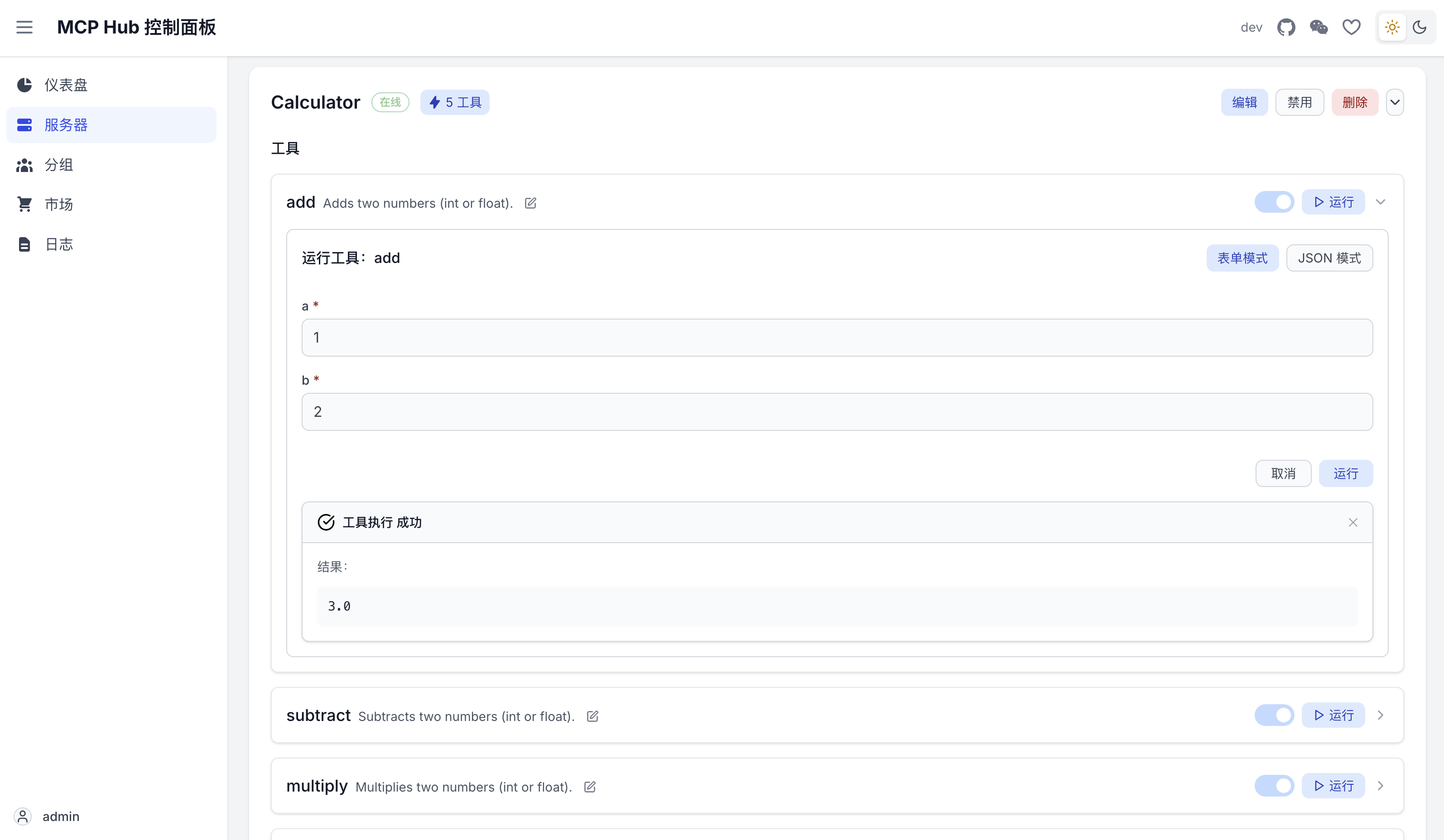 "description": "An MCP extension that provides a calculator supporting addition, subtraction, multiplication, and division.",