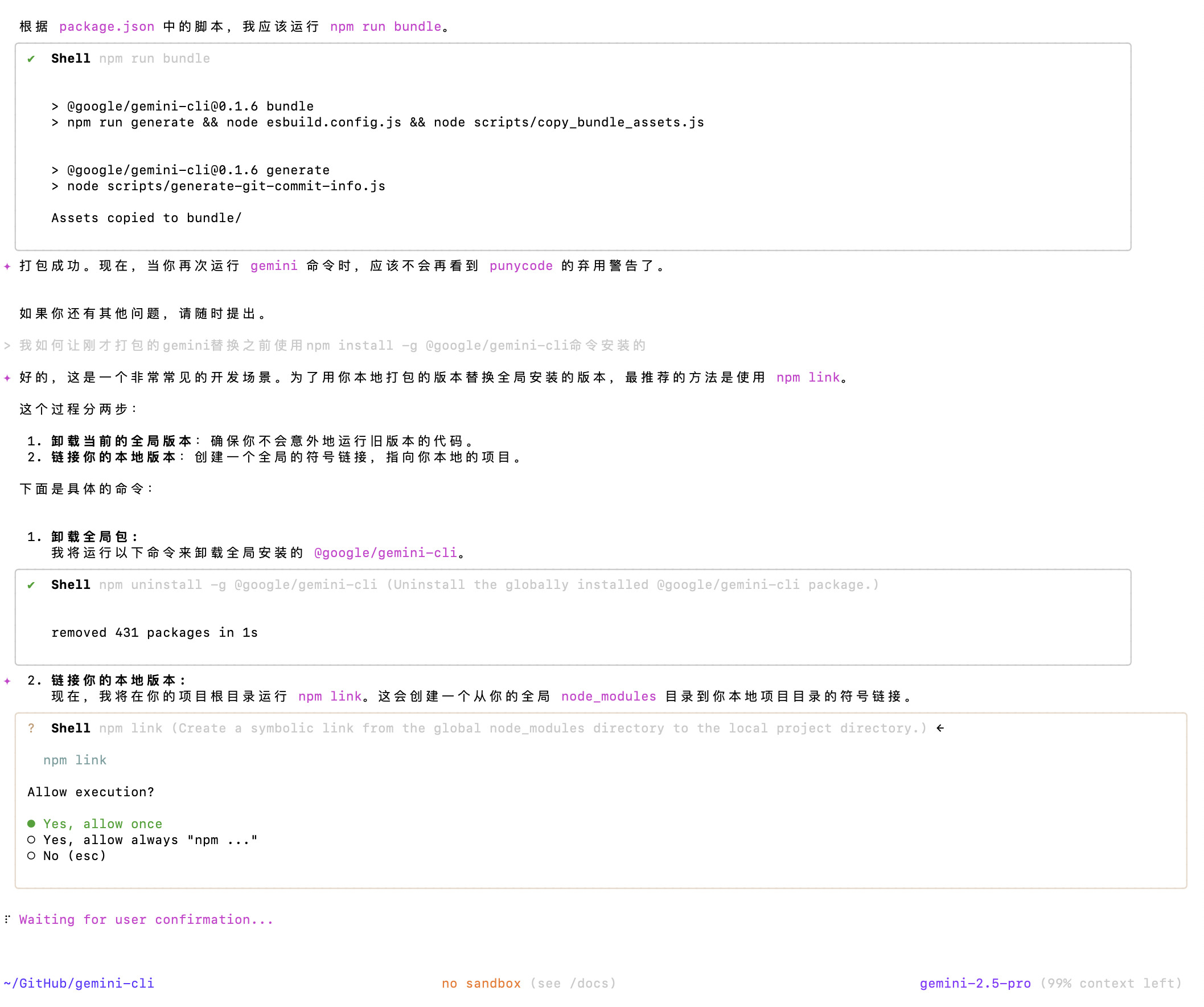 通常情况下,当 Gemini CLI 需要执行一个操作(比如读写文件、执行 shell 命令)时,它会先向用户请求许可,用户需要手动确认后才能继续。但在 YOLO 模式下,这个确认步骤会被跳过,所有操作都会被自动批准并立即执行。