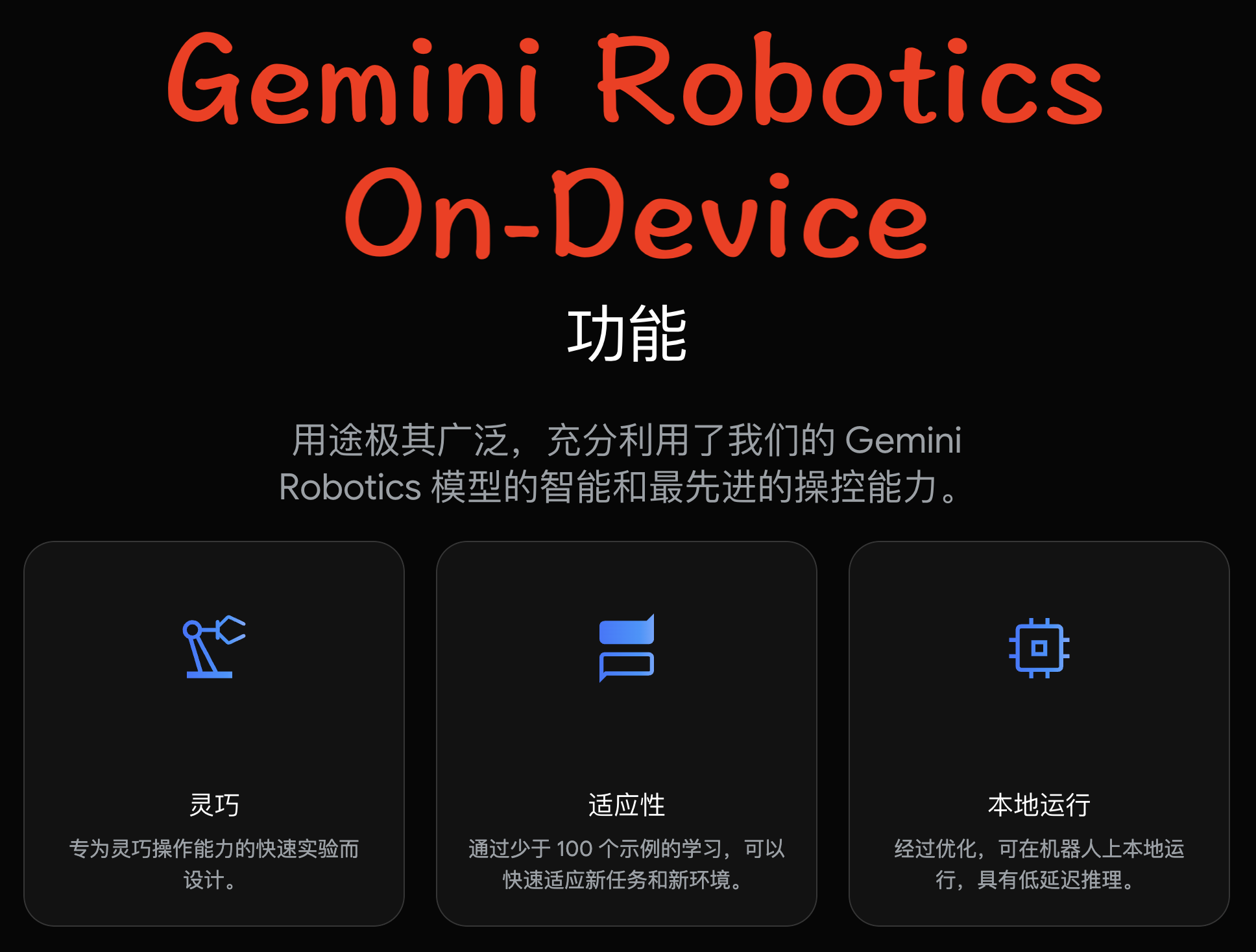 - 模型描述: “Gemini Robotics On-Device 是我们基于设备端 Gemma 模型的先进视觉-语言-动作 (VLA) 模型。它专为通用机器人操作而设计,可在本地设备上高效运行。该模型支持广泛的任务、场景和多种机器人类型。”