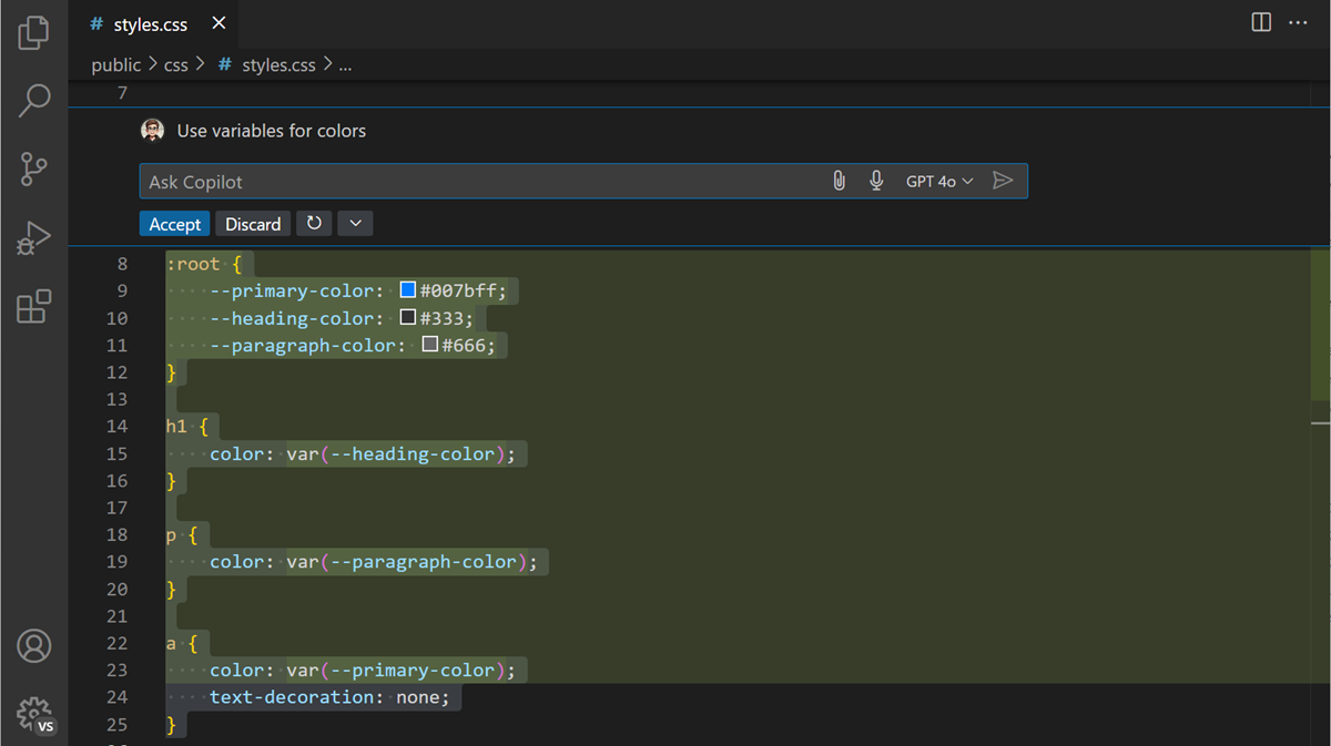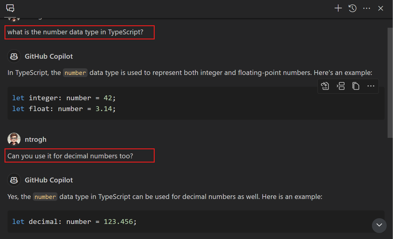 Inline Chat 使您能够直接从编辑器与 Copilot 进行聊天对话,而无需离开您的工作上下文。使用 Inline Chat,您可以在代码中就地预览代码建议,这对于快速迭代代码更改非常有用。