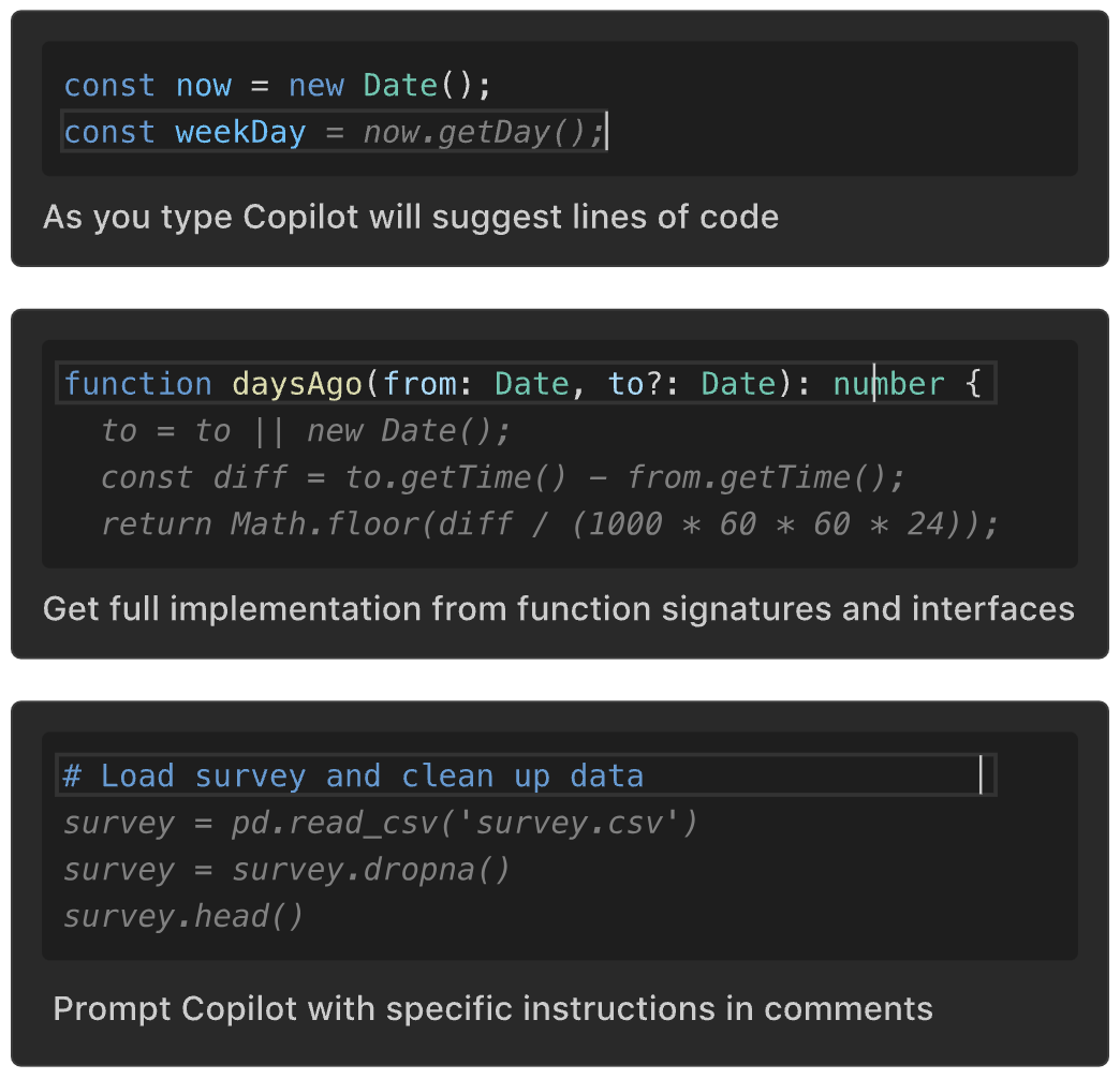 Copilot 会在你输入时建议代码行,并为函数签名提供多行建议。注释中的提示会根据你期望的结果、逻辑和步骤提供具体的建议。