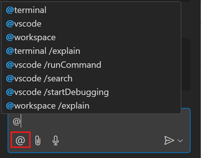@vscode- 询问有关 VS Code 的问题/search- 为工作区搜索生成查询参数/runCommand- 搜索并执行 VS Code 中的命令/startDebugging- 生成启动配置并在 VS Code 中开始调试(实验性)