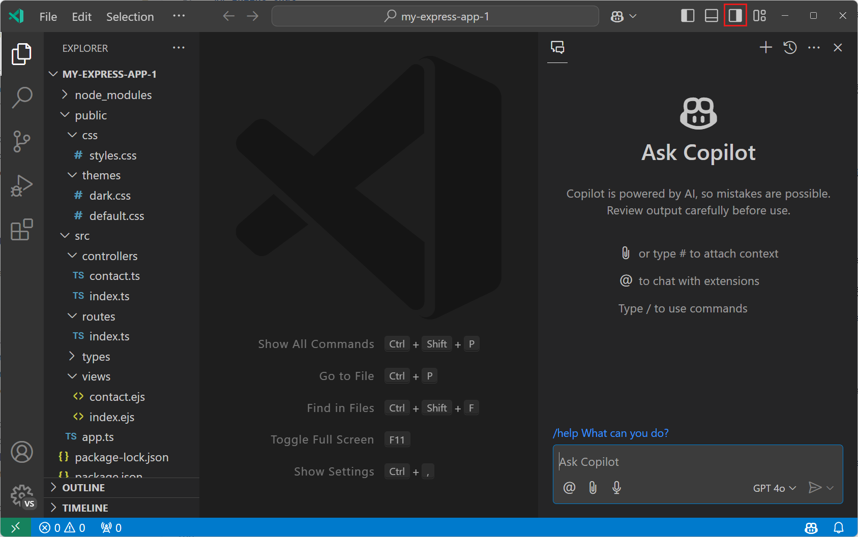 例如,@workspace 参与者有一个斜杠命令 /new,用于创建新的工作区或新文件。在聊天输入字段中键入 @workspace /new Node.js Express Pug TypeScript 将创建一个带有 Node.js Express Pug TypeScript 项目的新工作区。
