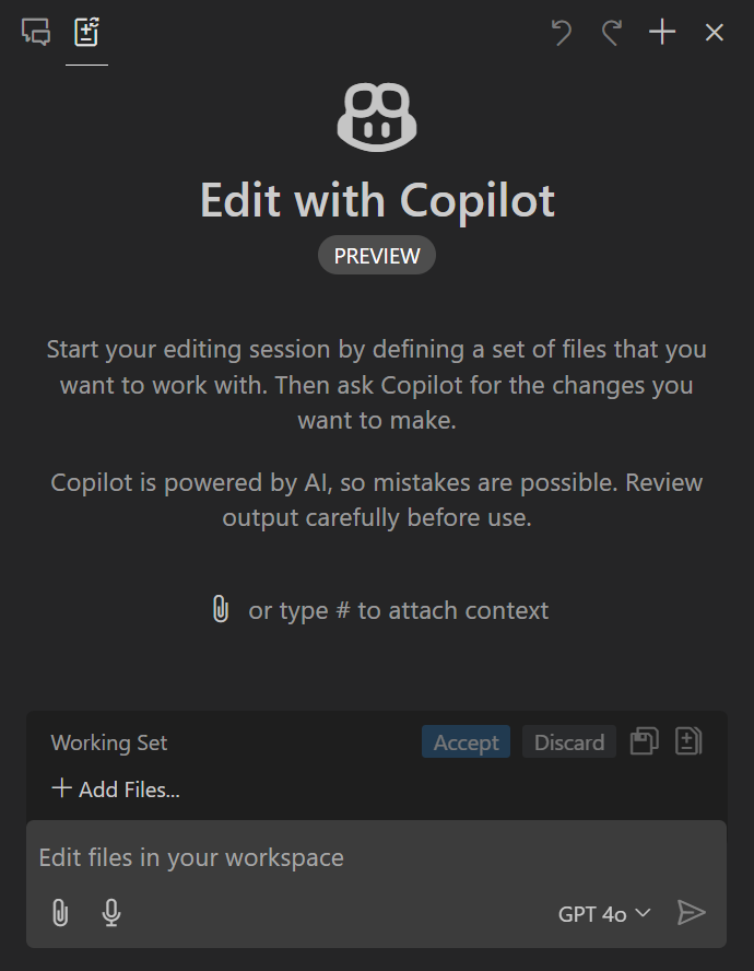 - Copilot Edits 会自动将打开的编辑器添加到工作集。