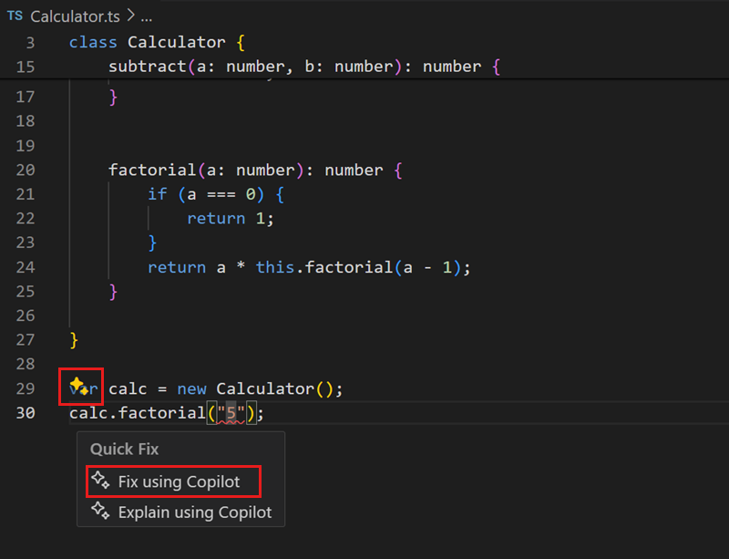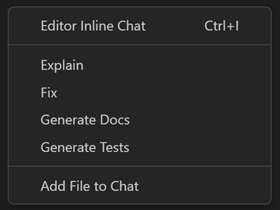 要通过上下文菜单提交提示,请在编辑器中右键单击,然后在出现的菜单中选择 Copilot,然后选择其中一个操作。智能操作也可以通过选择代码行时有时会出现的闪光(sparkle)图标访问。