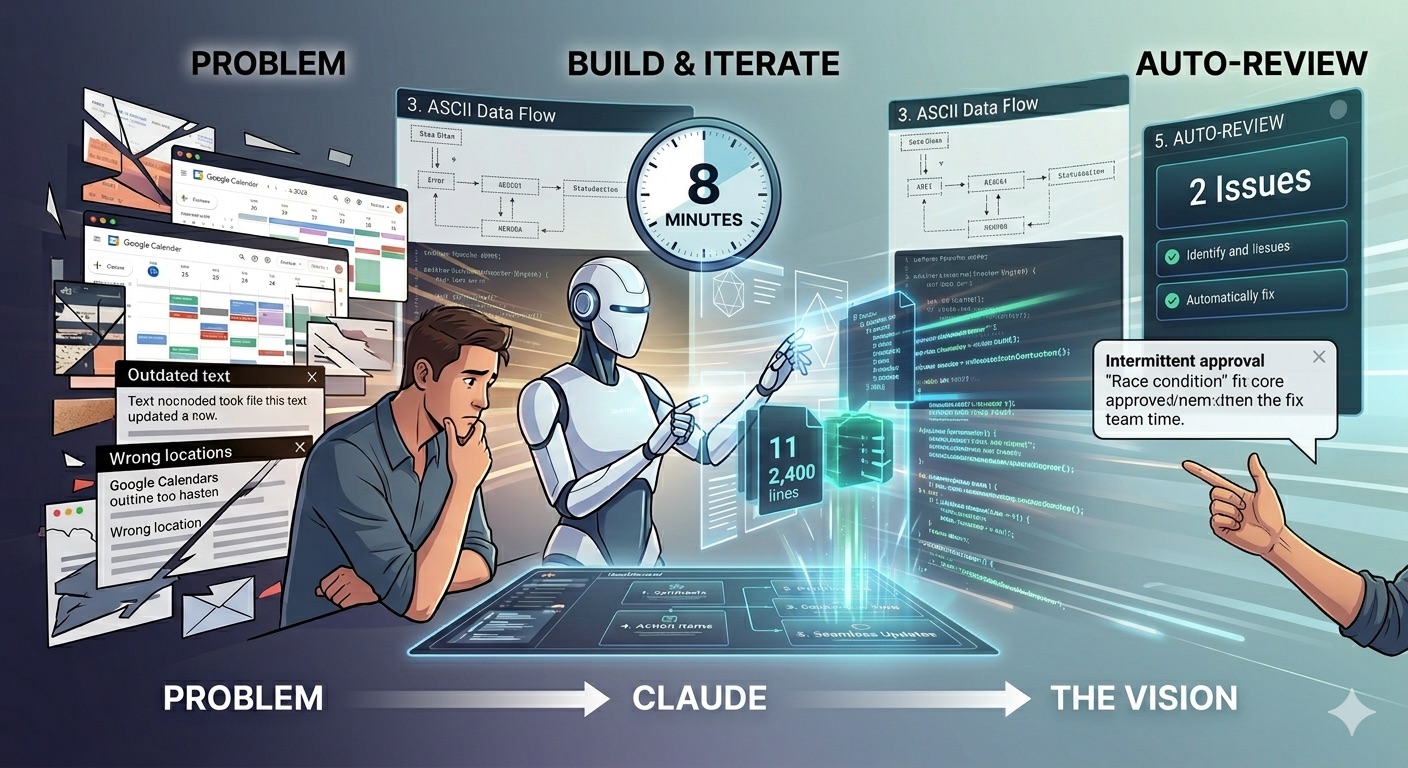 图 3:全自动构建与自动迭代。Claude(图 1、图 2 中的形象)在一个充满活力的全息工作台上操作。它的界面变成了流动的蓝绿色代码流,迅速生成了 11 个文件和 2,400 行代码,并组装成图 1 中定义的 AI 私人幕僚长的核心。背景时钟显示“8 分钟”,强调速度。在右侧的“自动审查”区域,AI 自动修复了 2 个问题,并在处理一个“竞态条件”时请求并获得了用户的批准。图 2 中的 ASCII 图表现在变成了活跃的代码。