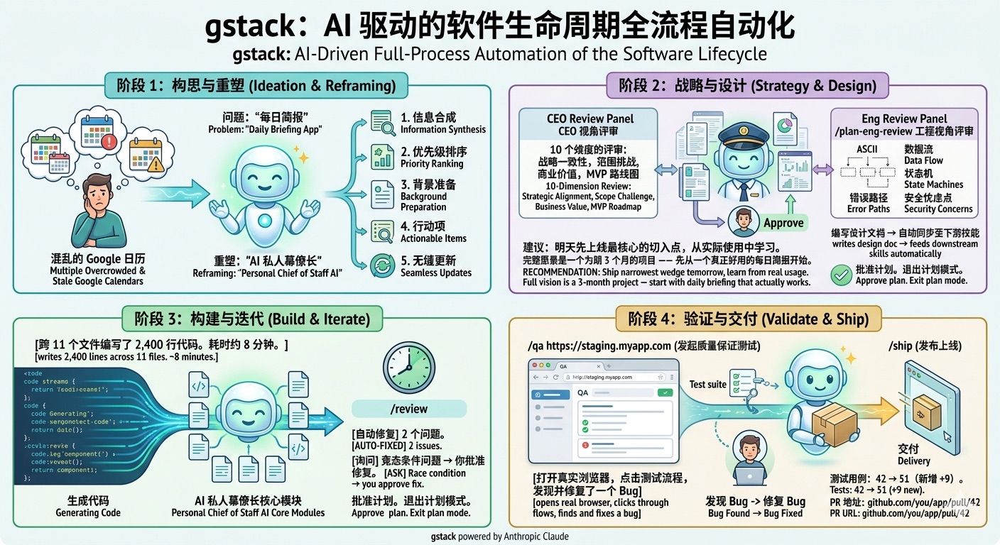 gstack 是由 YC 首席执行官 Garry Tan 发起的开源智能体技能集(Skills),旨在将 Claude Code 等 AI 编程助手重塑为一支全栈虚拟开发团队。它通过一套高度专业化的指令流,实现了从产品构思、架构设计、自动化编码到代码评审、质量保障及发布部署的软件全生命周期闭环开发。
