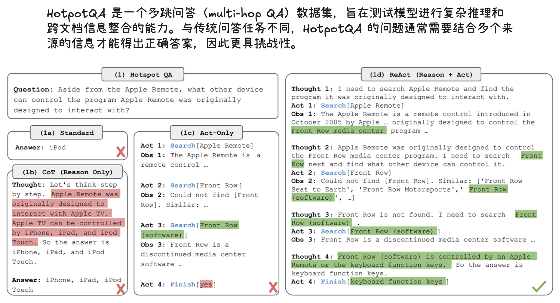 - 观察(Observation): 获取行动的结果(例如搜索结果、计算答案)。 模型根据观察到的新信息,继续进行下一轮的思考和行动,直到问题解决。