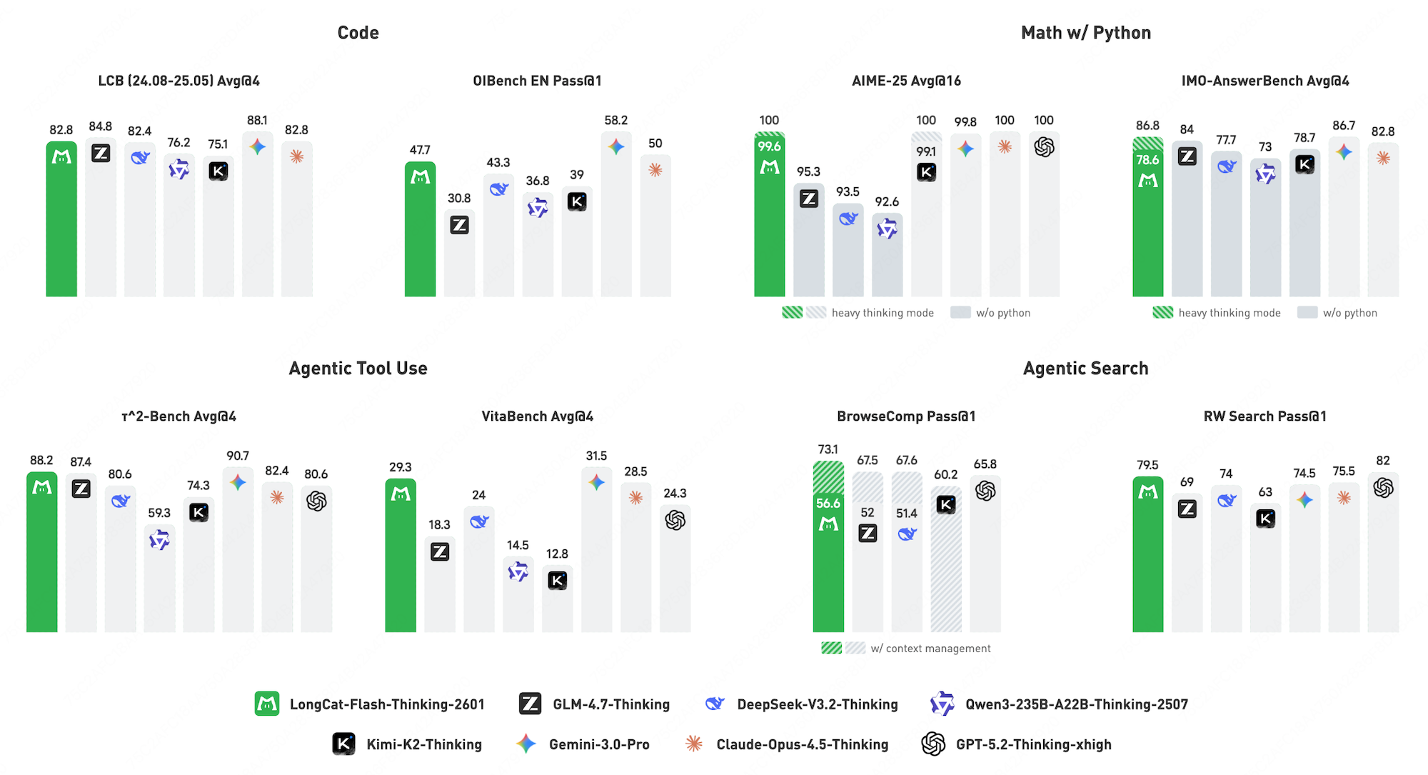 表格中对比了 LongCat-Flash-Thinking-2601 与主流开源推理模型(如 DeepSeek-V3.2、GLM-4.7 等)及闭源模型(如 GPT-5.2、Claude-4.5 等)在数学推理、智能体搜索、工具使用、通用问答和代码编程五个核心领域的性能表现。结果显示,该模型在智能体搜索和工具使用(Agentic Search & Tool Use)基准上表现卓越,在 BrowseComp、VitaBench 和随机复杂任务等多项测试中均位居开源模型首位,甚至在 RW Search 上表现仅次于 GPT-5.2。此外,在开启重思考模式(Heavy Thinking Mode)后,其数学推理(如 AIME-25 满分)和通用问答能力显著提升,达到了可比肩顶级闭源推理模型的第一梯队水平。