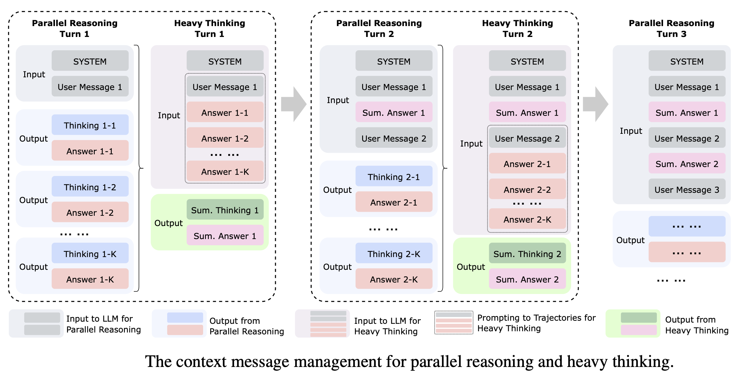 - 之前的“总结答案 1”和新的“用户消息 2”共同构成新的输入,传递给下一轮的并行推理。