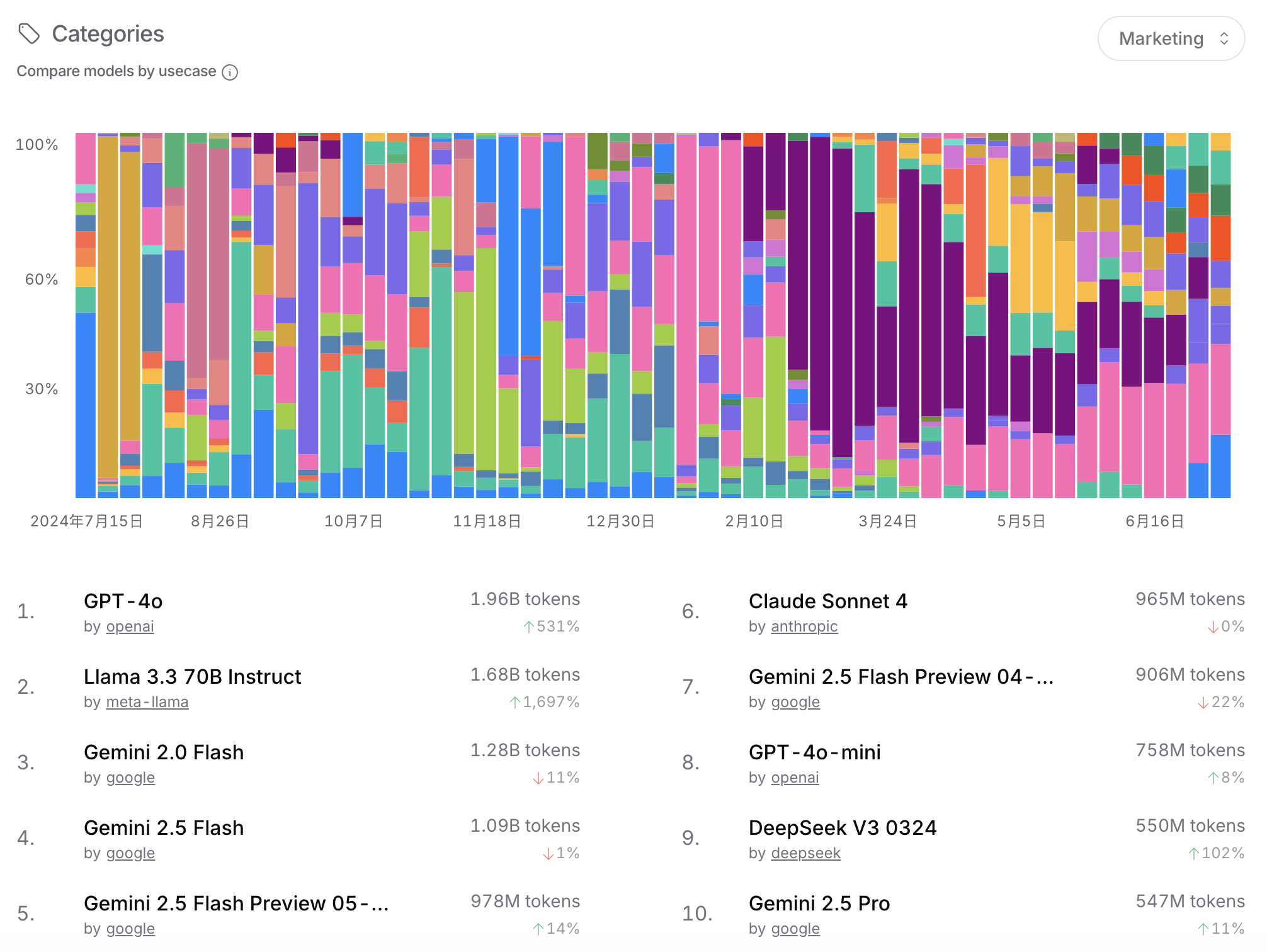 而在这场“AI大混战”中,Google爸爸的Gemini系列模型绝对是遥遥领先,市场份额高达43.2%!几乎占据了半壁江山!其次是黑马Deepseek(19.1%)和我们熟悉的Anthropic(18.7%)。OpenAI虽然也榜上有名,但市场份额相对较小,只有6.2%。看来,大模型的竞争格局正在悄悄发生变化哦!