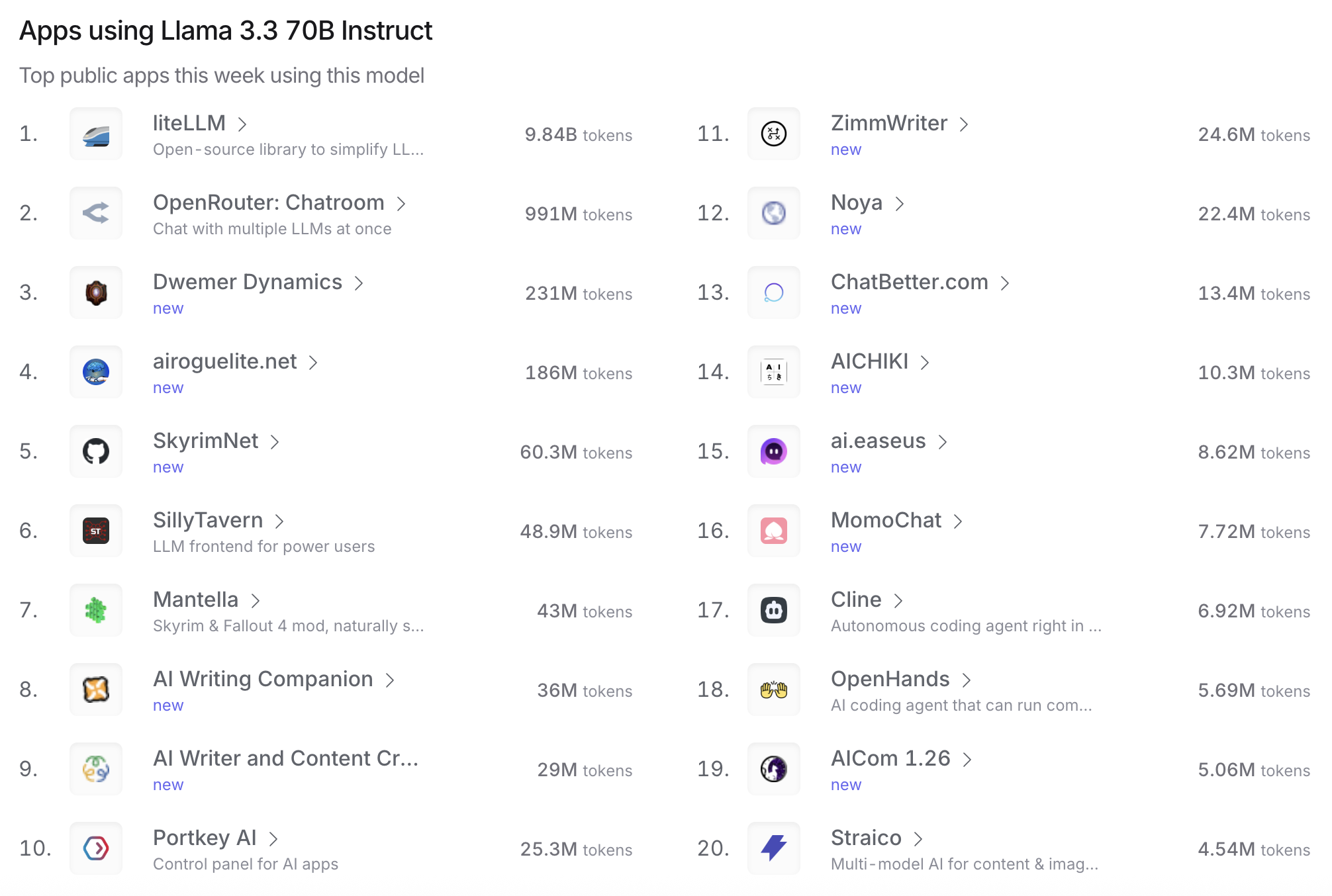 Llama 4 Maverick / Llama 3.3 70B Instruct: Llama家族在OpenRouter上也有不俗的表现,特别是在一些智能代理和自动化工具的应用中。比如Llama 4 Maverick在Linkd(智能链接)中表现出色。