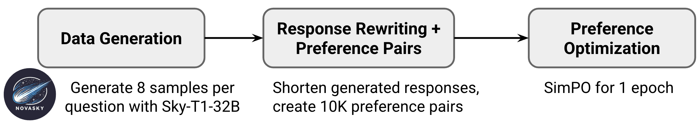 我们使用 Sky-T1-32B-Preview 为 PRM800K 数据集中的 12K 个问题生成回答。对于每个问题,我们使用温度参数 1.0 并生成 8 个回答,以创建不同长度的回答。然后,我们形成偏好对来对比”冗长”与”简洁”的解决方案。具体来说,从生成的回答中,我们选择最短的正确回答作为正样本,最长的正确回答作为负样本。我们丢弃了其余的生成回答,并丢弃任何没有产生至少两个正确回答的问题。我们假设对这些偏好对进行优化可以鼓励模型减少过度思考。