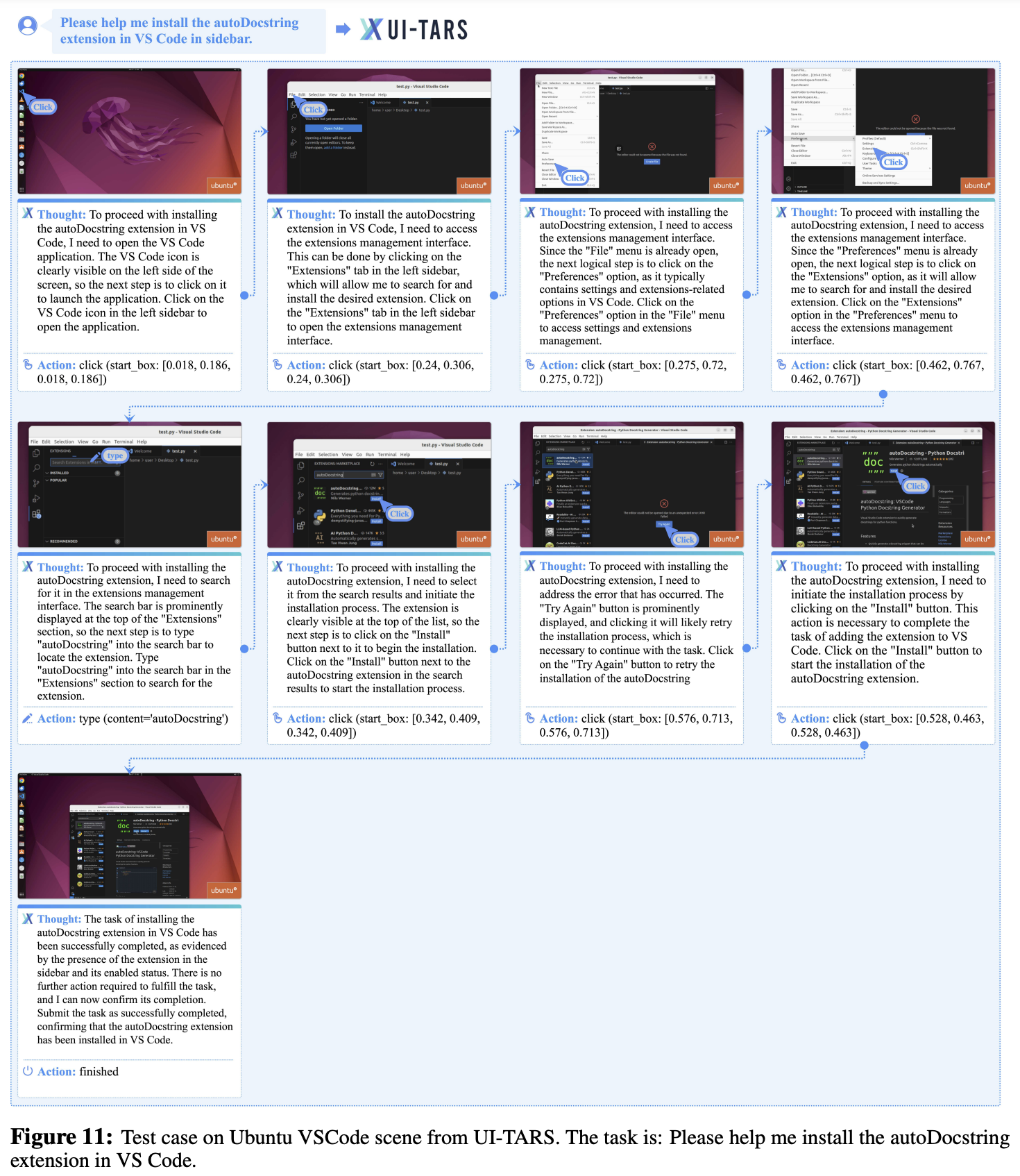 图11:UI-TARS在Ubuntu VSCode场景上的测试案例。任务是:请帮我在VS Code中安装autoDocstring扩展。