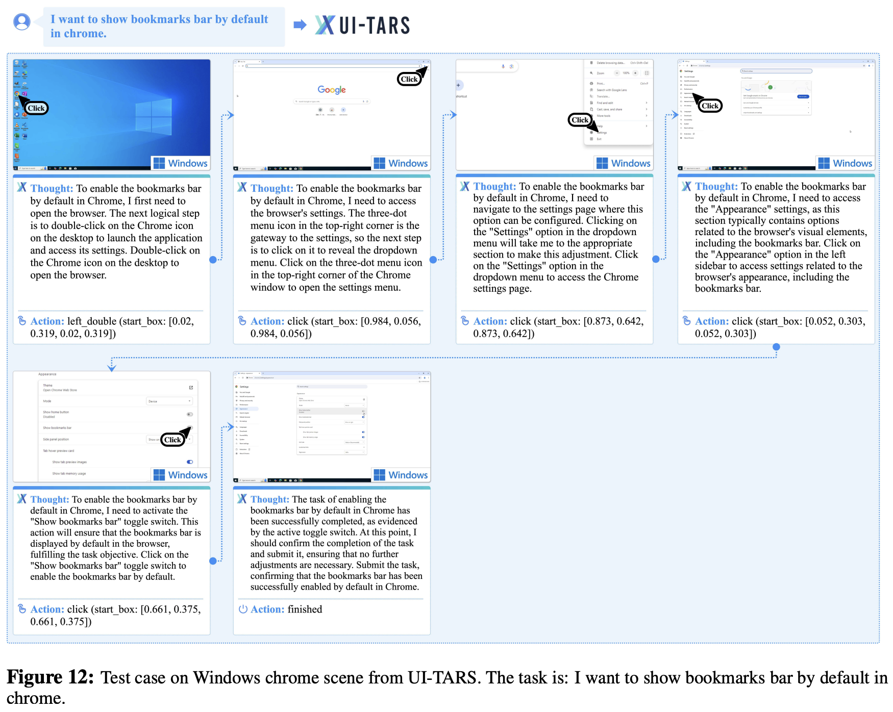 图12:UI-TARS在Windows chrome场景上的测试案例。任务是:我想在chrome中默认显示书签栏。