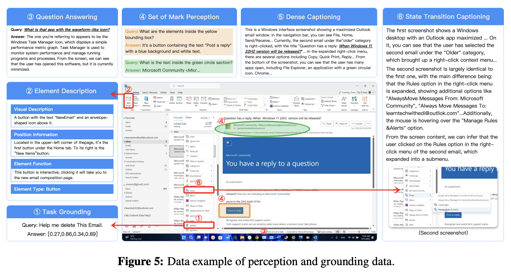 Enhanced Perception for GUI Screenshots (§ 4.2): GUI environments, with their high information density, intricate layouts, and diverse styles, demand robust perception capabilities. We curate a largescale dataset by collecting screenshots using specialized parsing tools to extract metadata such as element types, bounding boxes, and text content from websites, applications, and operating systems. The dataset targets the following tasks: (1) element description, which provides fine-grained, structured descriptions of GUI components; (2) dense captioning, aimed at holistic interface understanding by describing the entire GUI layout, including spatial relationships, hierarchical structures, and interactions among elements; (3) state transition captioning, which captures subtle visual changes in the screen; (4) question answering, designed to enhance the agent’s capacity for visual reasoning; and (5) set-of-mark prompting, which uses visual markers to associate GUI elements with specific spatial and functional contexts. These carefully designed tasks collectively enable UI-TARS to recognize and understand GUI elements with exceptional precision, providing a robust foundation for further reasoning and action.