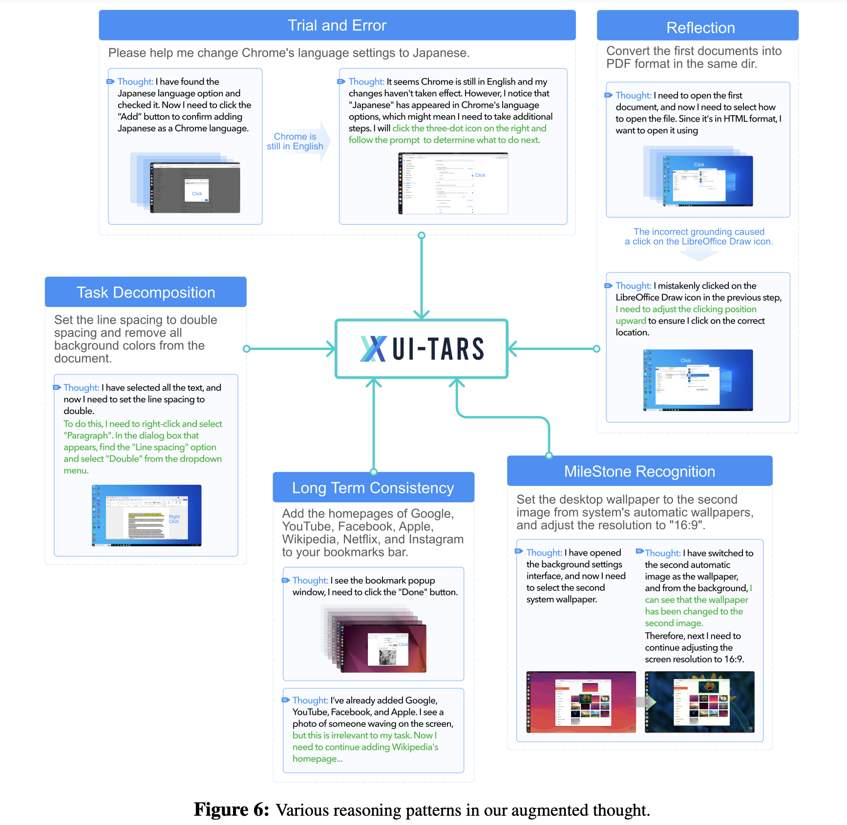 System-2 Reasoning for Deliberate Decision-making (§ 4.4): robust performance in dynamic environments demands advanced reasoning capabilities. To enrich reasoning ability, we crawl 6M GUI tutorials, meticulously filtered and refined to provide GUI knowledge for logical decision-making. Building on this foundation, we augment reasoning for all the collected action traces by injecting diverse reasoning patterns—such as task decomposition, long-term consistency, milestone recognition, trial&error, and reflection—into the model. UI-TARS integrates these capabilities by generating explicit “thoughts” before each action, bridging perception and action with deliberate decision-making.