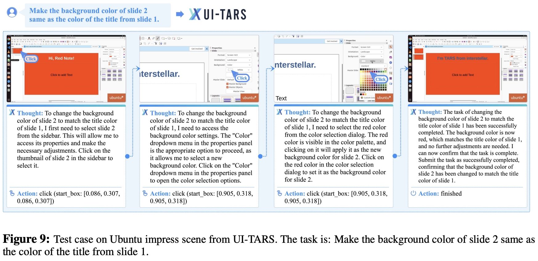 图9:UI-TARS在Ubuntu impress场景上的测试案例。任务是:使幻灯片2的背景颜色与幻灯片1的标题颜色相同。