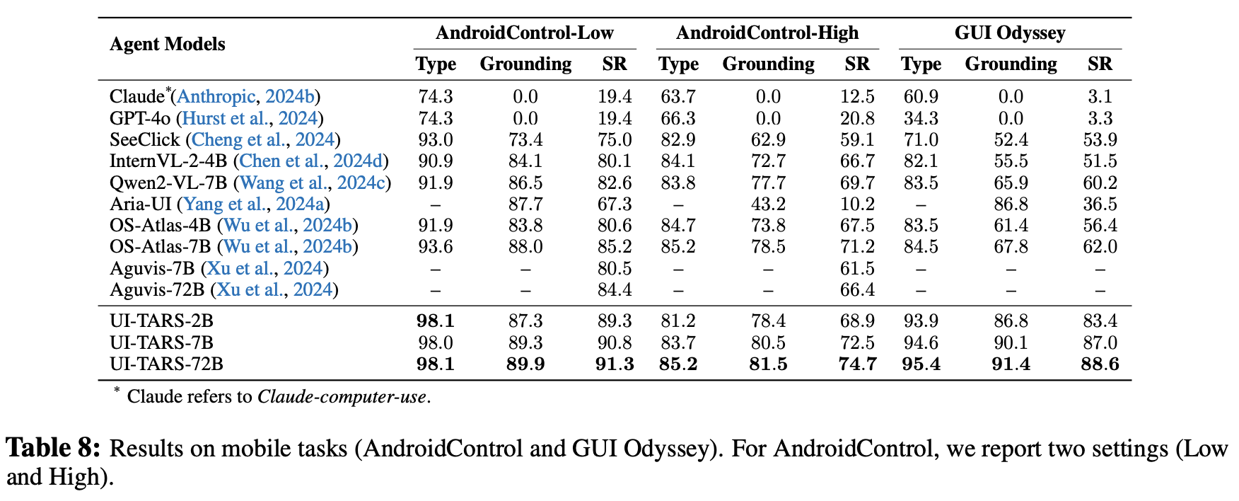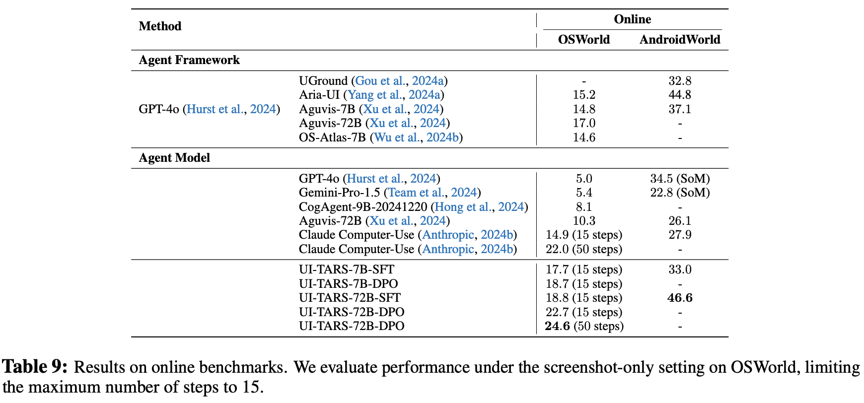 Agent Capabilities: extensive evaluations highlight UI-TARS ’s superior agent capabilities. Experiments demonstrate exceptional performance in reasoning-intensive benchmarks, with the 72B variant particularly excelling in multistep and dynamic tasks. Notably, UI-TARS achieves excellent results on challenging benchmarks such as OSWorld (Xie et al., 2024) and AndroidWorld (Rawles et al., 2024a). In OSWorld, UI-TARS-72B achieves scores of 24.6 with 50 steps and 22.7 with 15 steps, outperforming Claude’s 22.0 and 14.9 respectively. In AndroidWorld, it achieves a score of 46.6, outshining GPT-4o’s 34.5, further emphasizing its ability to tackle high-complexity real-world scenarios.