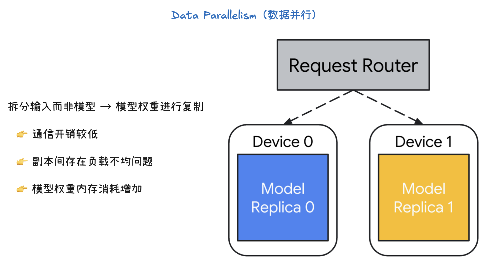 - 模型权重(Model weights)在每个设备上都被完整地复制了一份(Model Replica 0, Model Replica 1)。