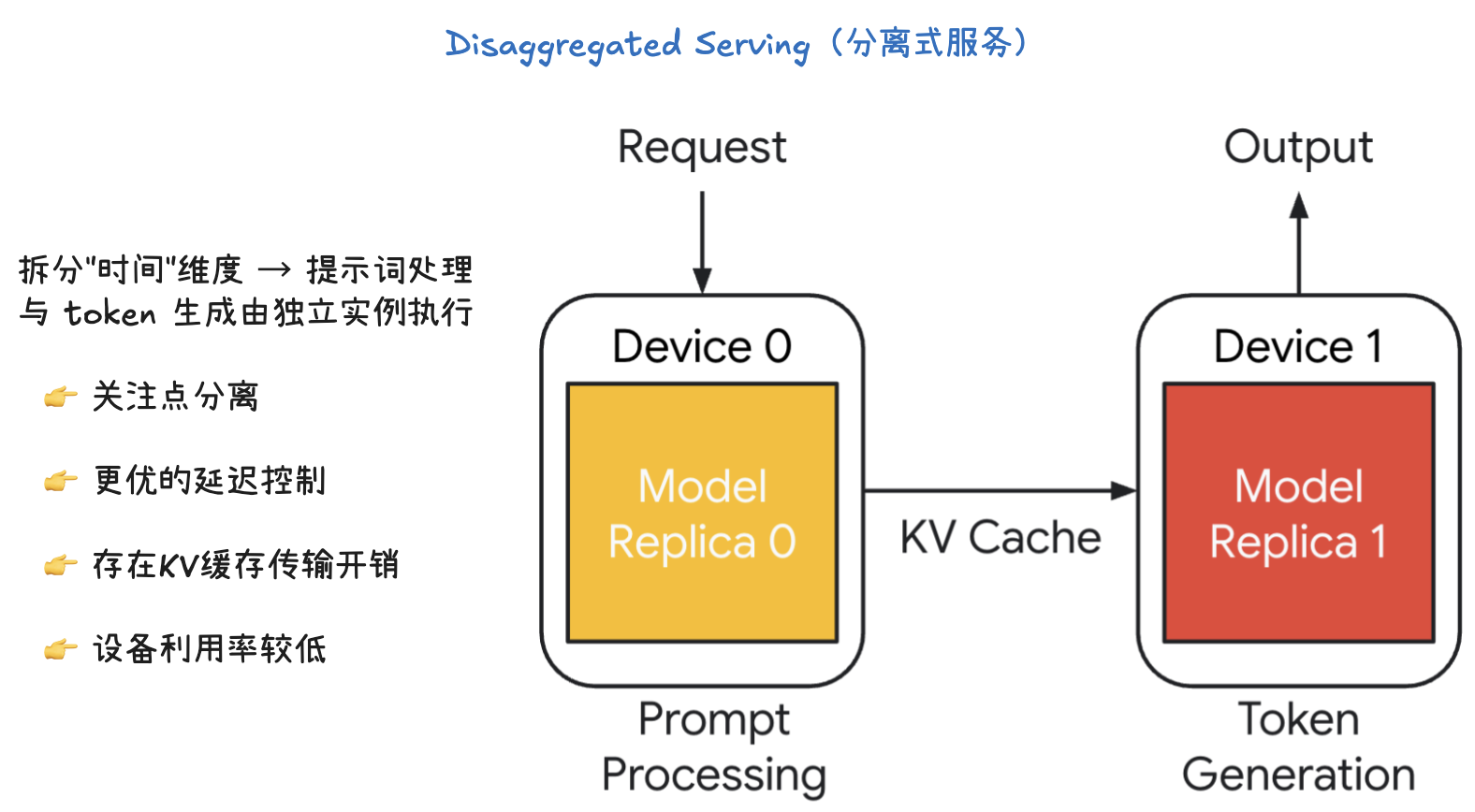 - KV Cache 传输开销(KV cache transfer overheads): 这种架构的主要缺点是需要在设备间传输 KV Cache。如果 KV Cache 很大,这个传输过程会产生显著的通信开销。