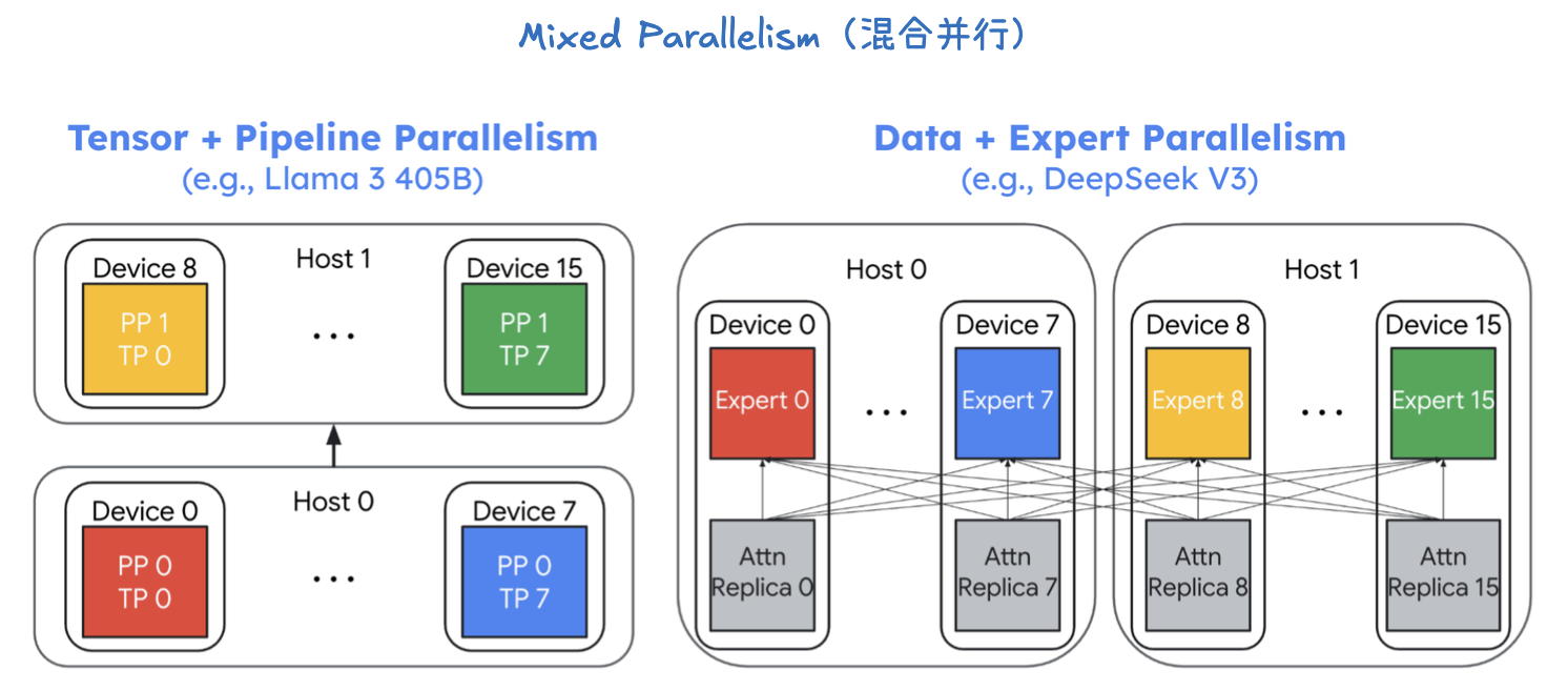 - 张量并行 (Tensor Parallelism, TP): 在每个流水线阶段内部,模型层仍然太大。因此,需要进一步使用张量并行。例如,在 Host 0 内部,PP 0 的计算被横向切分到 设备 0 到 7。每个设备都只处理该层的一部分权重。