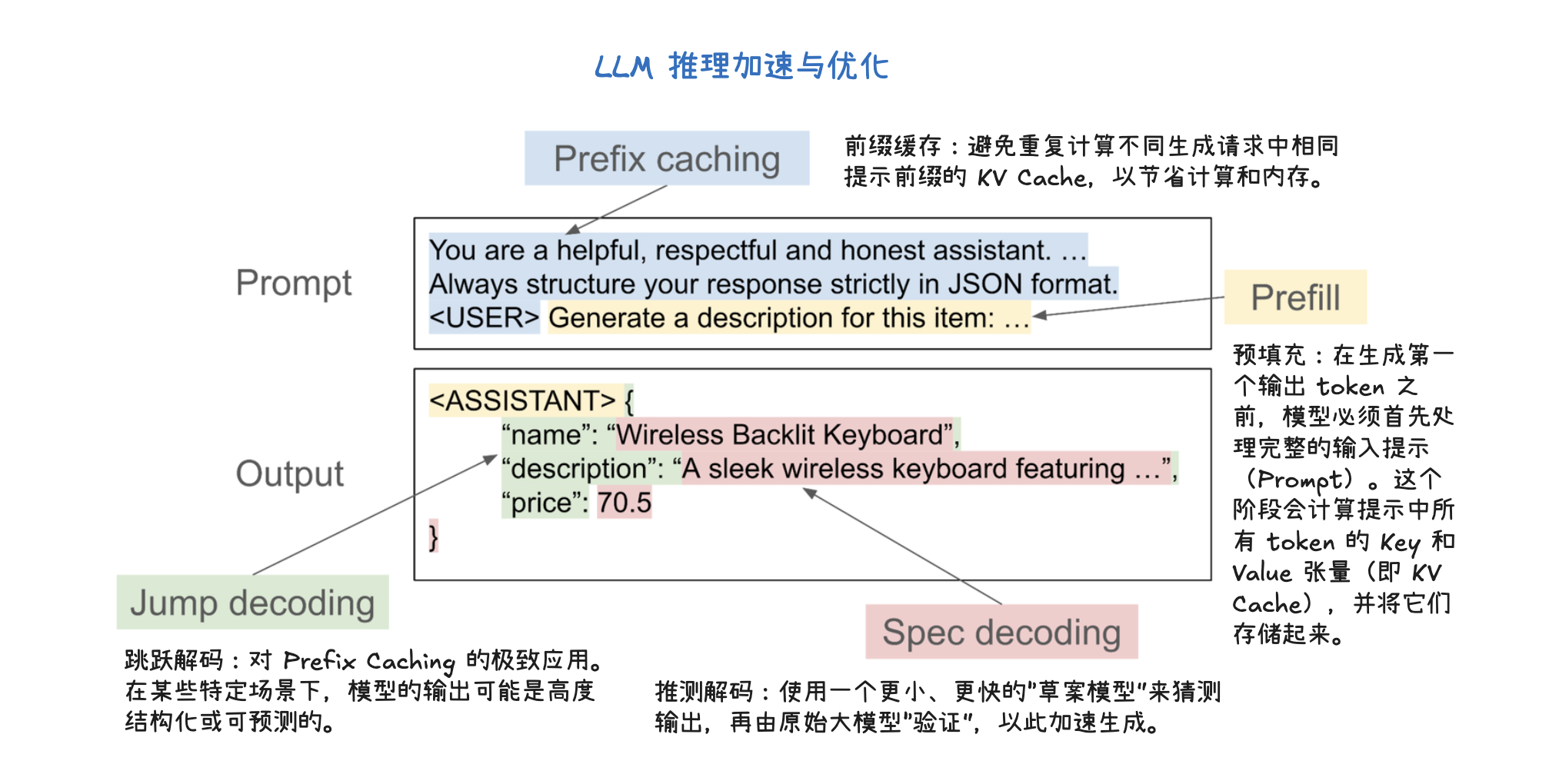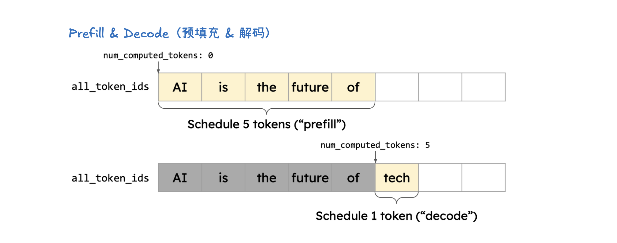- 令牌生成(Token Generation): 这是一个迭代的生成过程。模型会根据上一步生成的 KV Cache,一步步地生成新的令牌,直到满足停止条件。